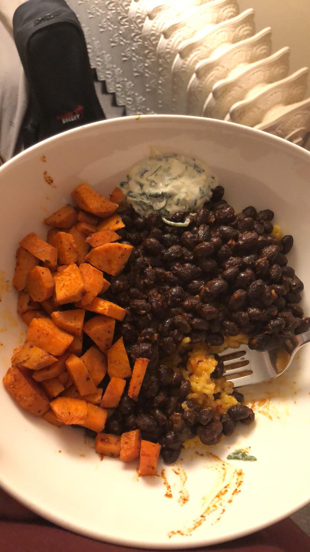 Cuban Chili ghost pepper black beans on curry rice, sour cream cilantro sauce, baked yam slices, and topped off with loads of Melinda’s ghost pepper hot sauce!