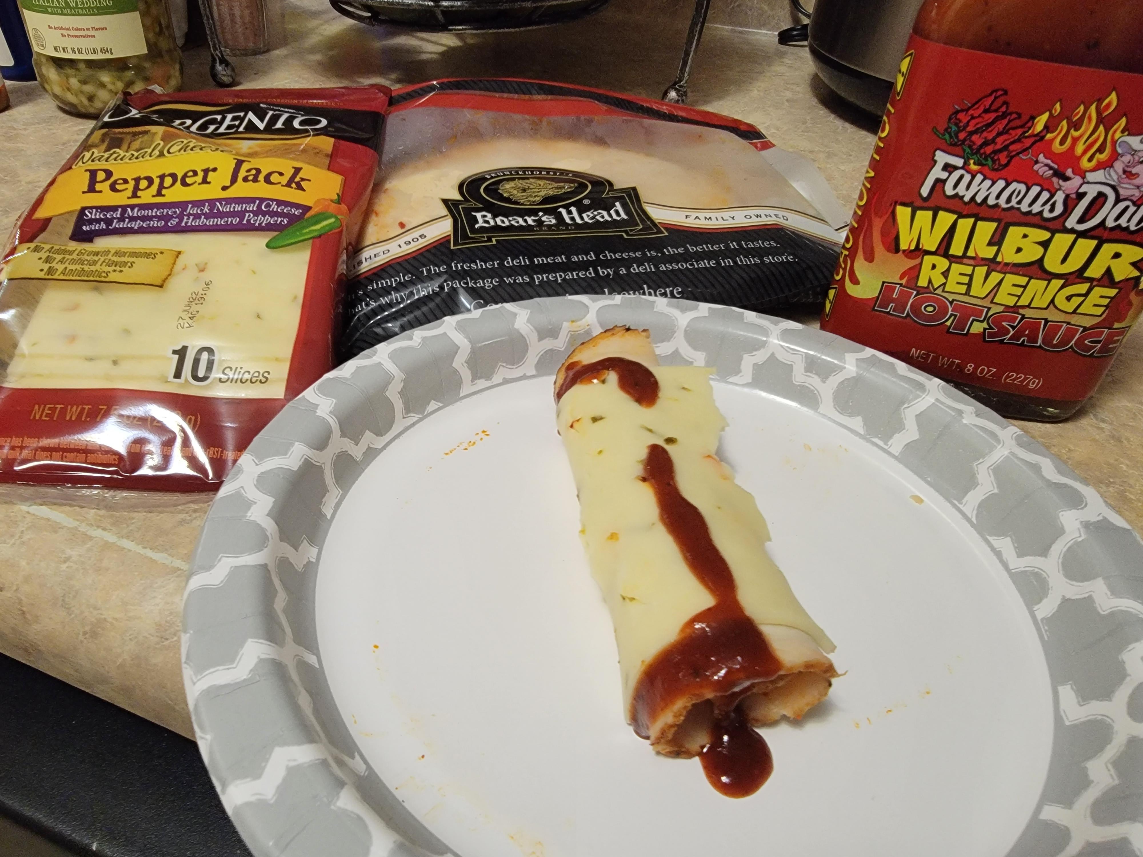 Spicy snack, Boars Head Blazing Buffalo chicken, Wlibers Revenge, & pepper jack