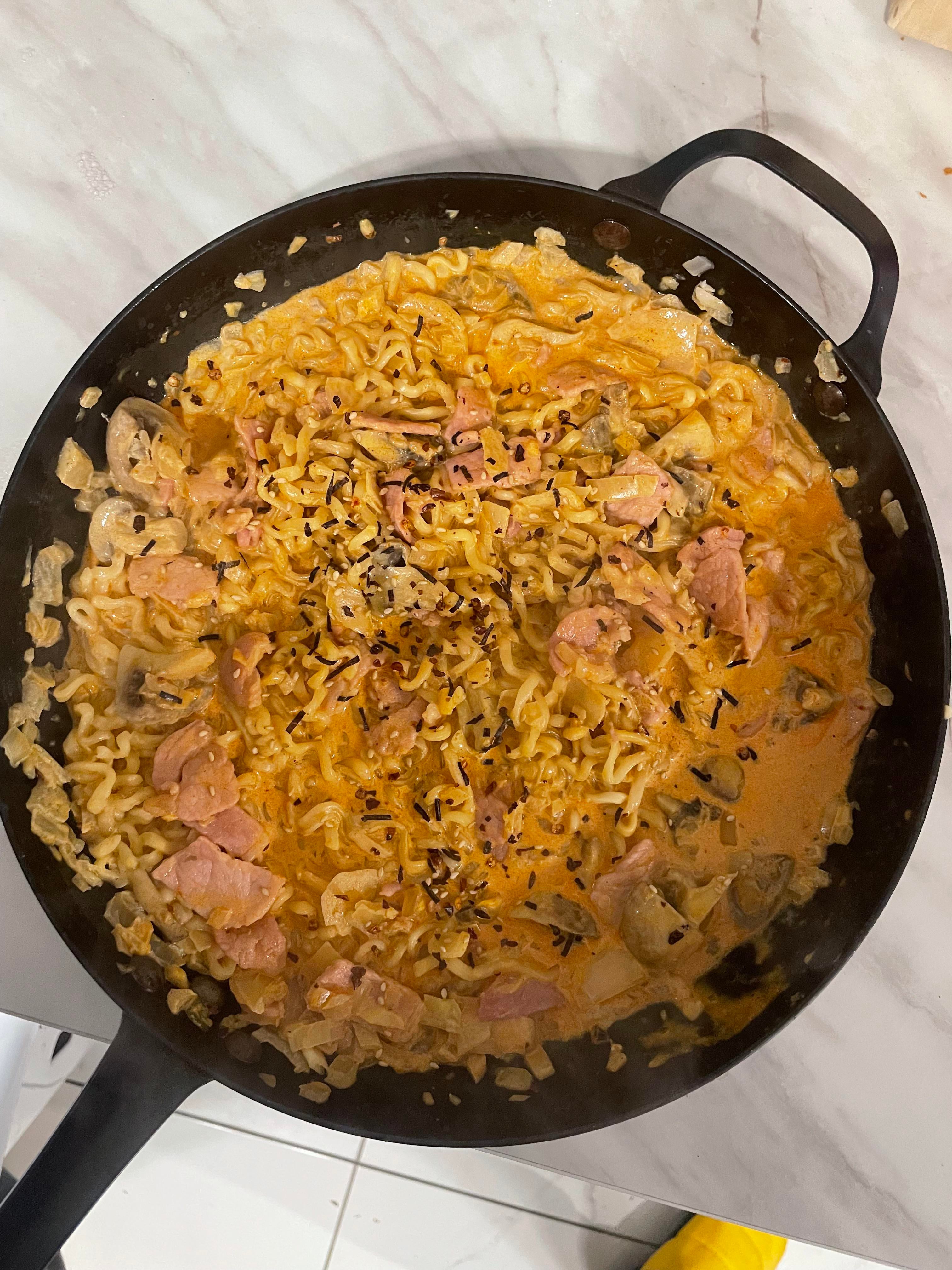 A bit of a twist on the 2x spicy noodles (I know we’re all bored of the same old pics. Mixed in some bacon, mushrooms and cream. With habanero flakes go top off.