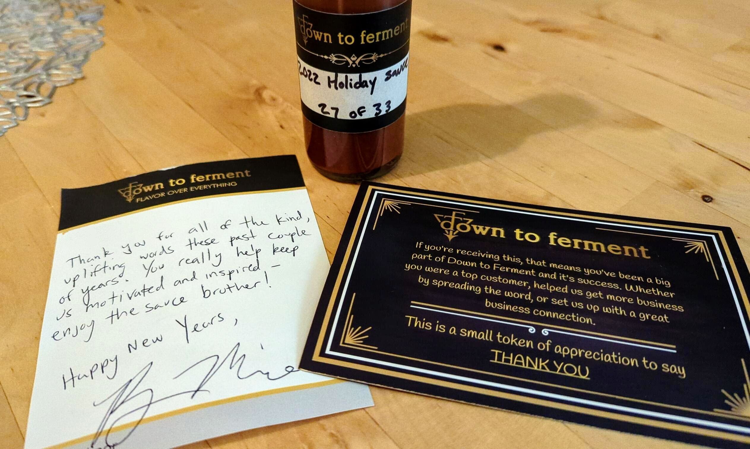The wonderful people of Down to Ferment sent me a note and a generous gift: #27 of 33 bottles of their special holiday ferment! I am honored and excited to try it on a special dinner menu that we’re planning!