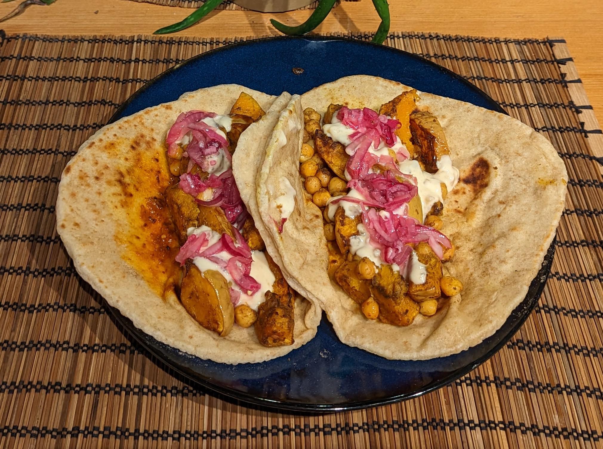 Roasted curried squash and chickpeas with Naga pickle, mango chutney yoghurt, and pickled red onion on sourdough naan Chilichili foodChili RecipesRecipeRedditReddit SpicySpicyspicy foodspicy recipes