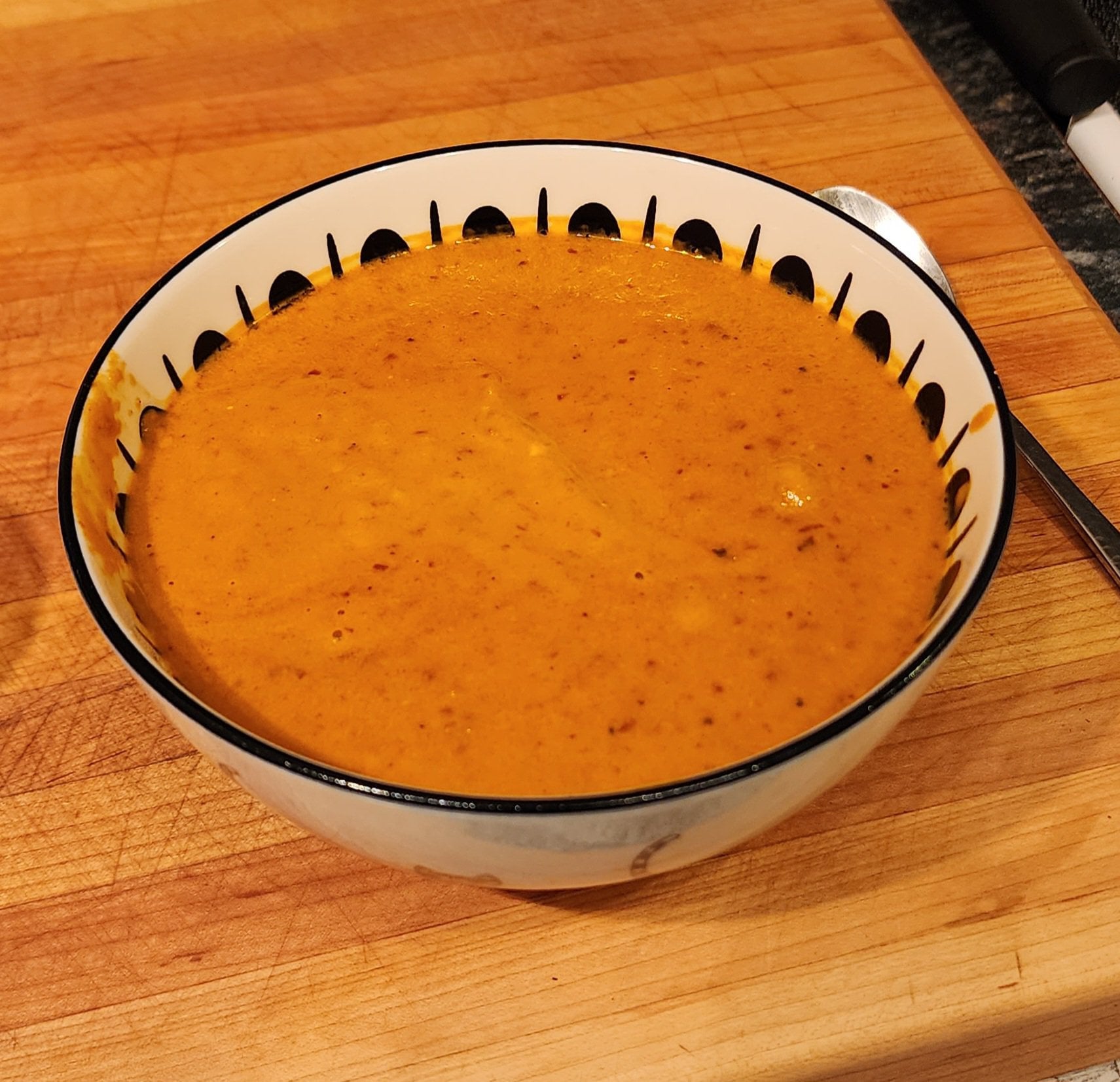 Fry tomato in oil until soft, add while garlic for one minute until starting to get some color, then throw in the chilies seeds removed and torn. Remove from heat and allow to cool.