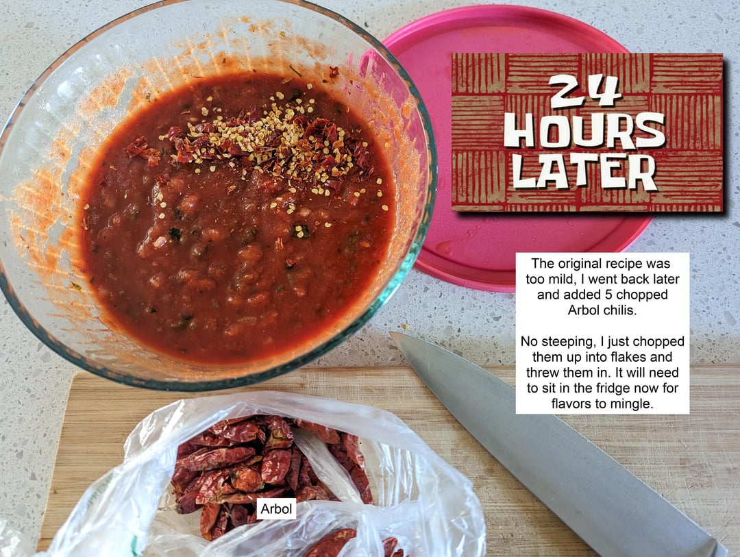 As soon as I tasted the salsa I instantly realized it is similar to the table salsa at my favorite Denver Mexican chain [Las Delicias](https://goo.gl/maps/eCuB8PapNbEUqwSL6), I’ve included a photo of their salsa for comparison. In the photo of Las Delicias salsa I do see a couple red pepper flakes however, it might just be something like Arbol for added hotness. Since my test salsa only got hotness from the pickled jalapeno it did come out pretty mild, I ended up adding 5 Arbol chilis the next day.