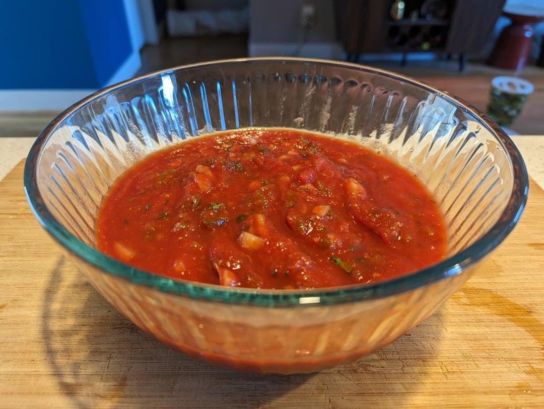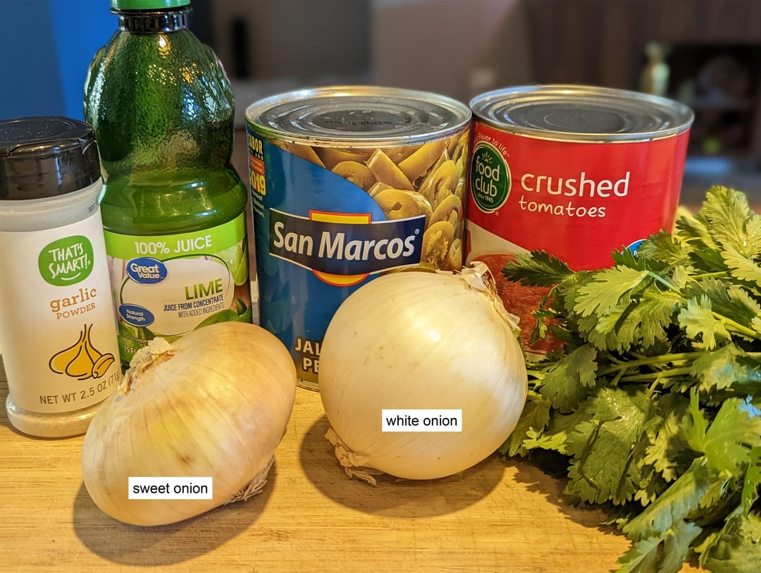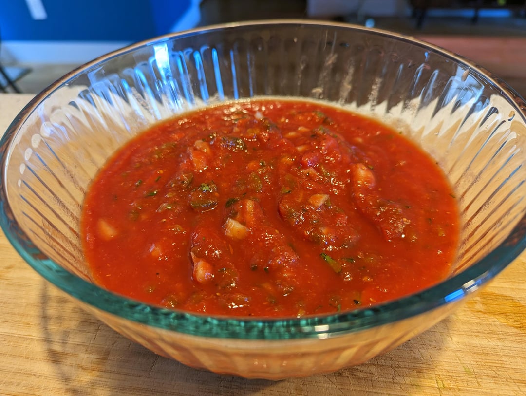 For a long time my go-to “restaurant style” salsa has been [this copycat](https://www.copymethat.com/r/VVlkwDZDX/el-toritos-salsa-el-torito-restaurant/) from chain restaurant El Torito. Restaurants need to quickly and cheaply produce large quantities of salsa so there’s typically a reliance on canned ingredients, minimal chopping or roasting of vegetables, and powdered spices. While browsing for recipe ideas I came across food blog [La Pina en La Cocina](https://pinaenlacocina.com/restaurant-style-salsa-easy-tomato-jalapeno-salsa) which has several interesting salsas including a pretty unique “restaurant style” which involves 1/4 cup of brine from canned pickled jalapenos as a key ingredient. Her recipe calls for gently cooking the onion to mellow it out, so I’m trying this recipe both ways, with raw onion and also gently cooked onion.