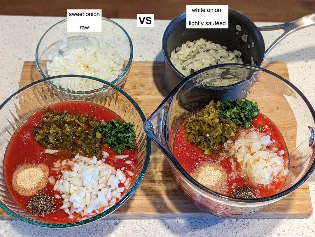 As for the test of two onions… Raw sweet onion was the winner. The crisp taste and texture from raw sweet onion nicely complimented the canned tomato. The cooked onion just felt “slimy” and lacking in texture by comparison.