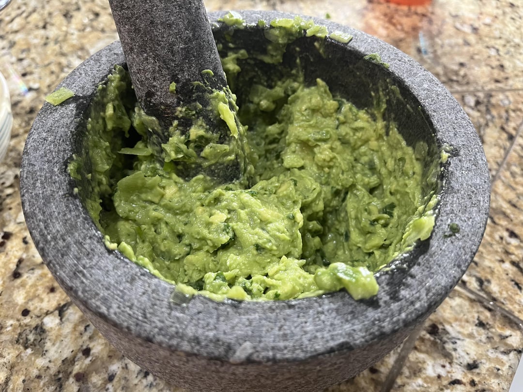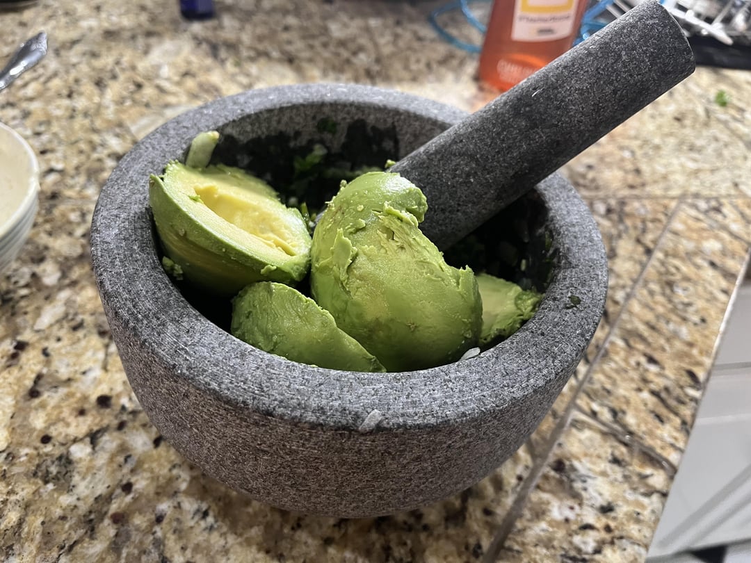 My base js garlic, jalapeño, cilantro, lime juice and salt. Grinding that all up to essentially a liquid in the stone mortar and pestle creates a magic flavor bomb. Don’t know if I could make it just mincing ingredients on a cutting board any more.