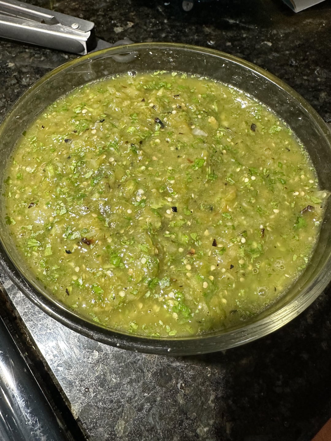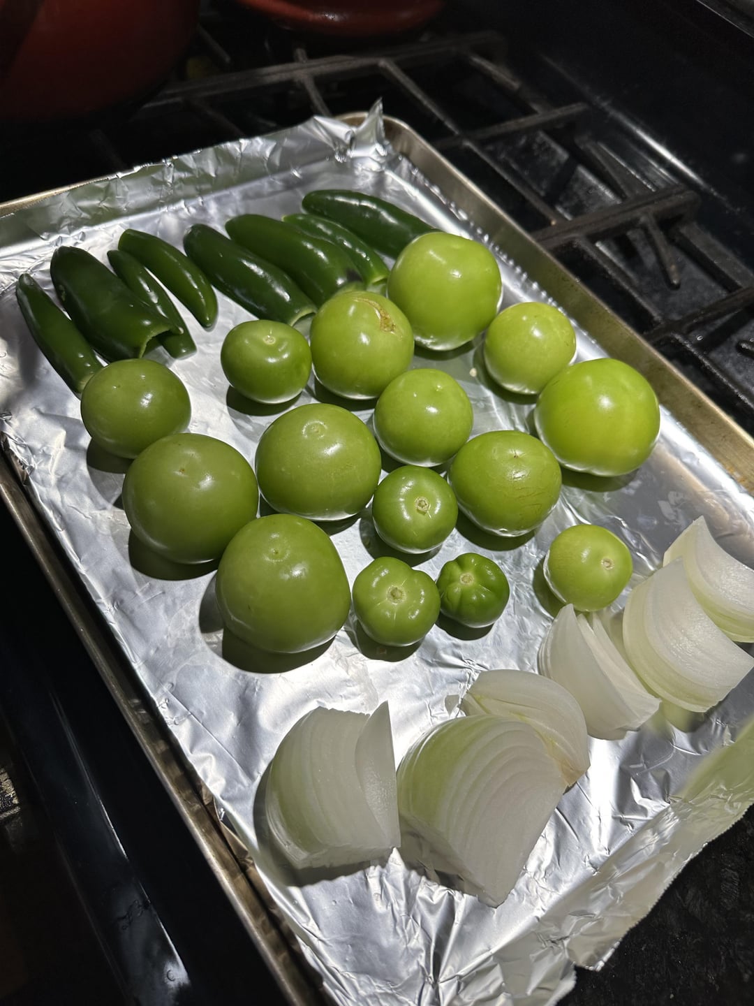 shawarmaking15 3 years ago Salsa verde2 serranos 2 jalapeños 24 oz tomatillos Half an onion 6 cloves roasted garlic Handful of cilantro Salt to tasteRoast everything under broiler, blend, add cilantro and salt to taste at the end. Then devour.