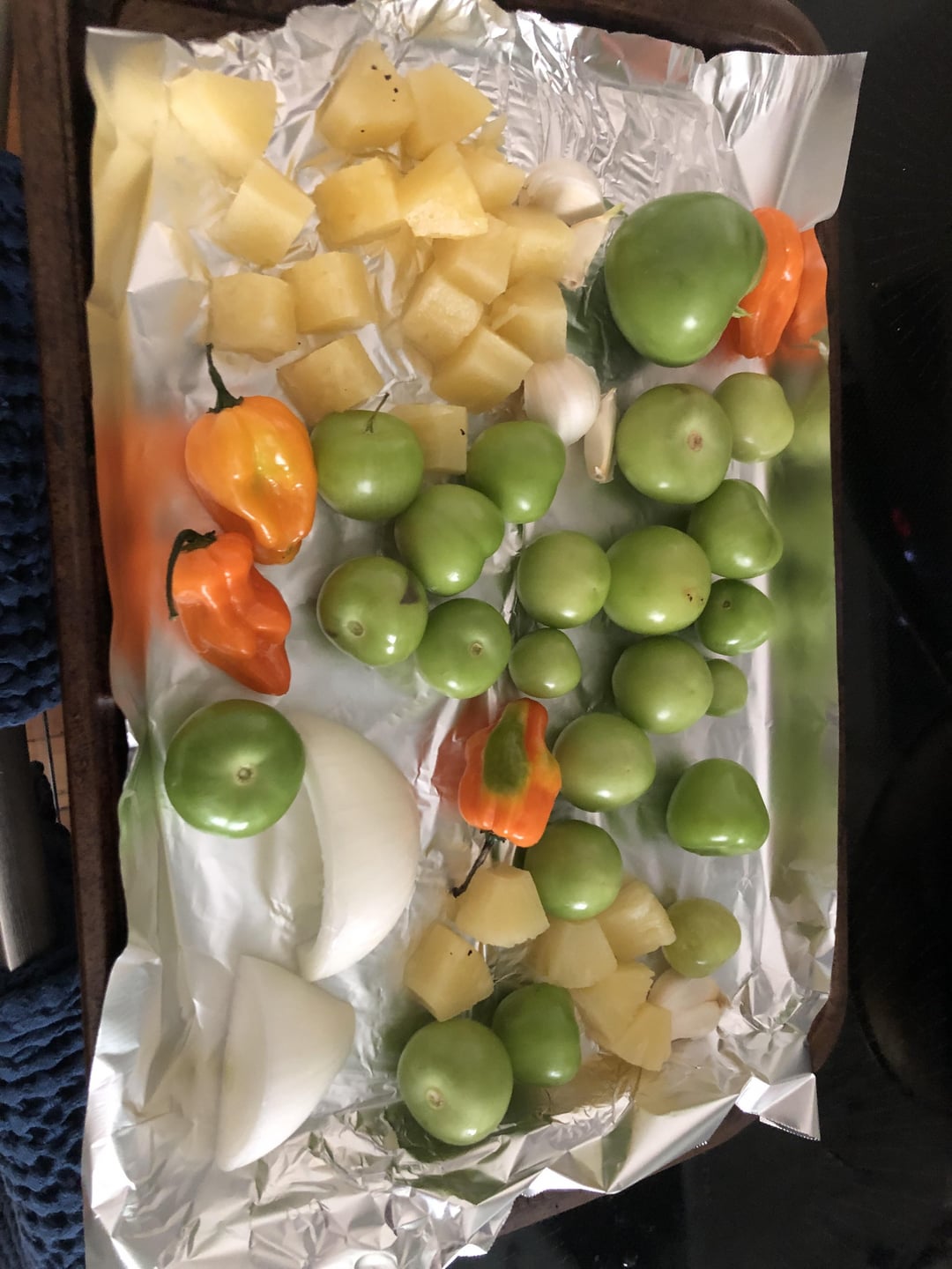 A little less than a lb of tomatillos , Half a head of garlic, Quarter onion , 4 habs, half a can of pineapples in juice (rinsed).
