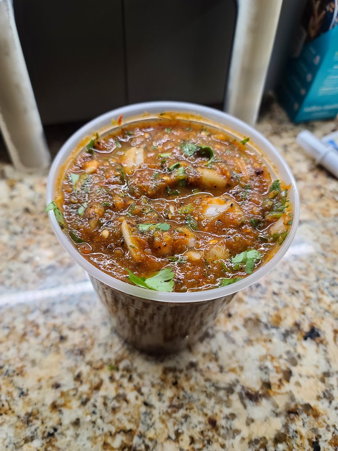 Blend the entire mixture. Food processor might work better depending on the consistency you prefer; but ours is small so I blend. Dice some extra onion and cilantro, throw it into the blended salsa, and it’s ready to go. Can add a little water to thin it out as well.