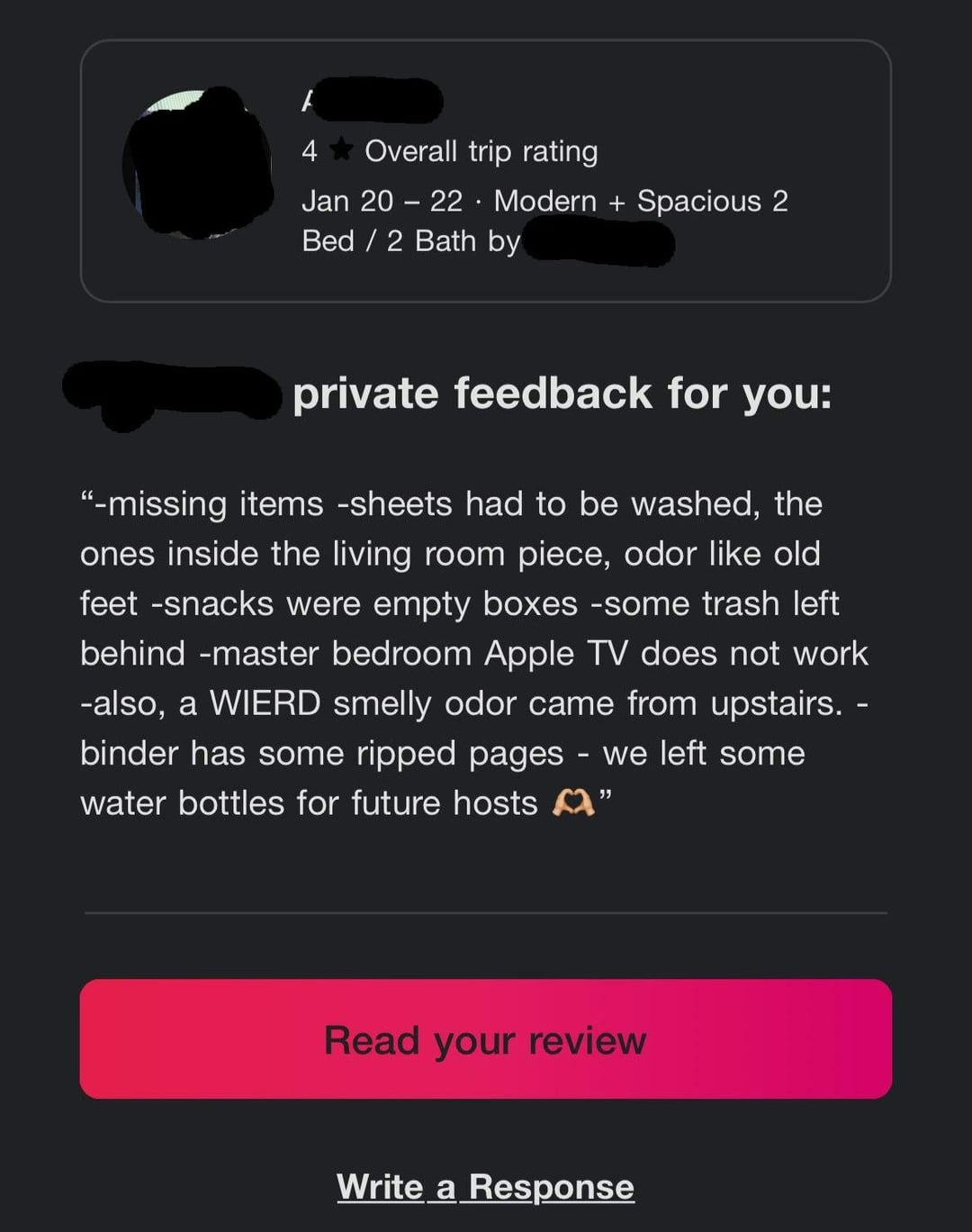 One weekend recently we decided to make a [Salsa Ceniza](https://www.reddit.com/r/SalsaSnobs/comments/kzkcmw/salsa_a_la_ceniza_one_of_my_top_3_salsas_that_i/) (literally ash salsa) that requires roasting until black about 20 jalapenos in the broiler. Despite running the kitchen hood and opening a door, the smell still managed to make its way downstairs to the basement apartment, earning them this negative feedback and a 4-star review 😂