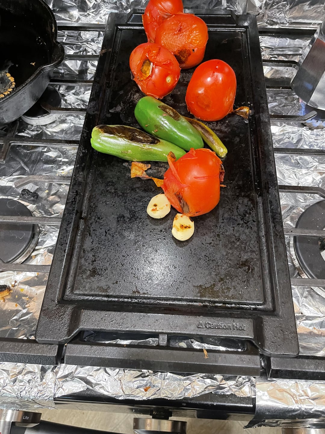 • Remove ingredients from griddle and set aside. Peel most of the dark burnt skin off of the tomatoes and chiles. You can leave a little bit for the smoky flavor. Peel the garlic.Â