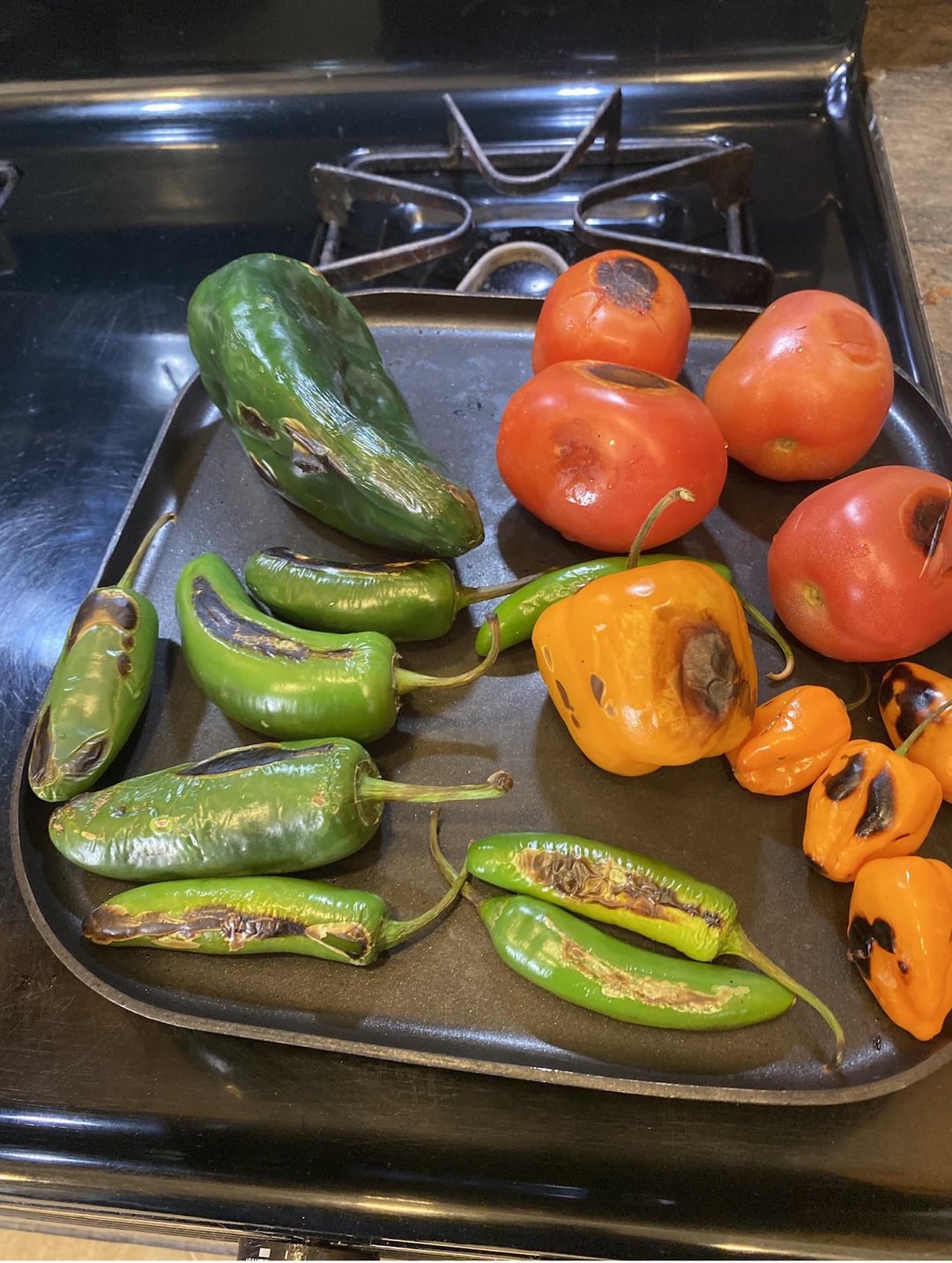 Roast everything on Camal or griddle or even pan work til chilies and tomatoes and garlic are toasted. then in sauce pan add chiles and tomatoes to boiling water til everything softened. Keep stock. Just add tomatoes and chiles and garlic to blender and and seasoning salsa has need. Salt and pepper be your preference. If want the salsa with more liquid use the stock that you save.
