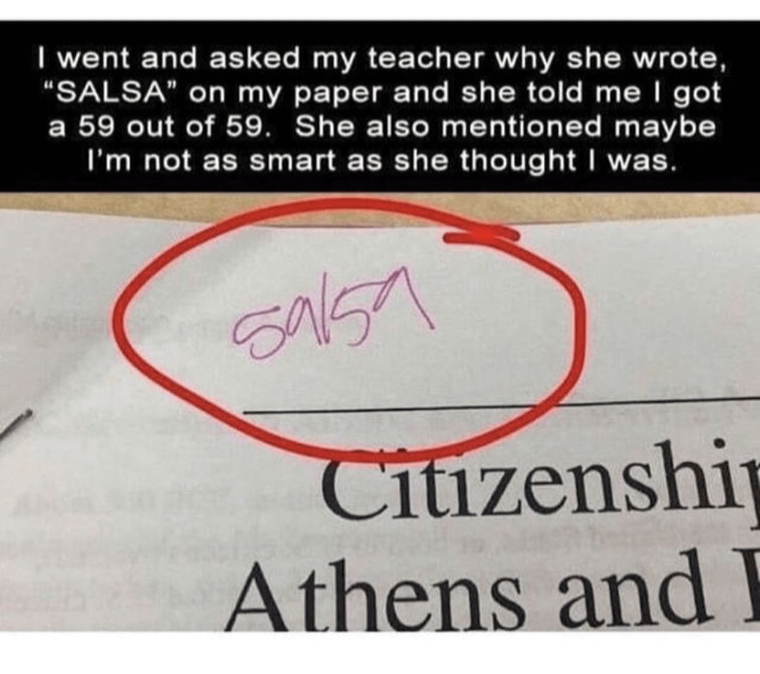 it’s shit post day on SalsaSnobs , happy new yearby exgaysurvivordan pico de gallosalsaSauce 3 Comments sonoran22 3 years ago she should have said congrats on your perfect score and love of salsa BrainwashedScapegoat 3 years ago Why is it 59 out of 59 what kind of a psychopath does that brandee95 3 years ago “I’m smart but also hungry”Write A CommentYou must be logged in to post a comment.