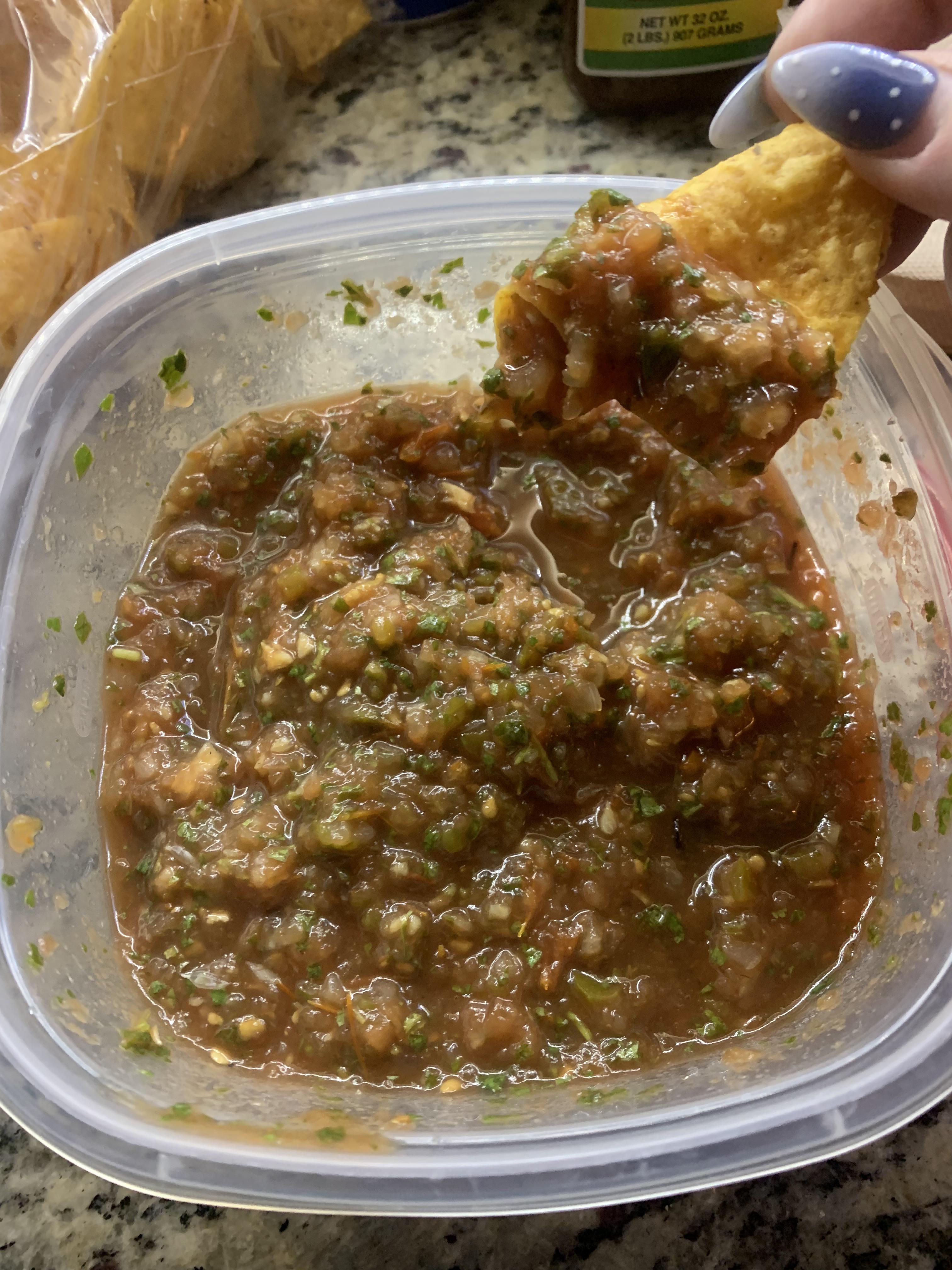 I took 6 plum tomatoes (cut in half), a pint of grape tomatoes (poked a hole in each), 2 yellow onions (quartered), 4 jalapeños (I only seeded 2 but you know how spicy you like stuff) and half a head of garlic (peeled but kept cloves whole) put them on a wire rack and smoke it all for 2 hours at 275f on my pellet smoker. Once done I threw it in my blender with 2 bunches of cilantro, the juice of 2 limes and salt.
