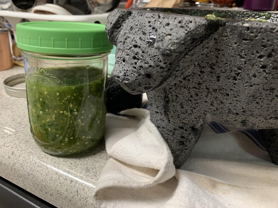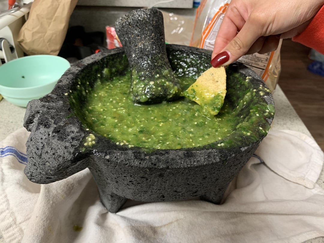 Boil the tomatillos and Serrano, blend or mash aromatics in blender or molcajete, add water from boiled veggies to taste. She wouldn’t tell me quantities of ingredients, so I won’t tell you either 😉