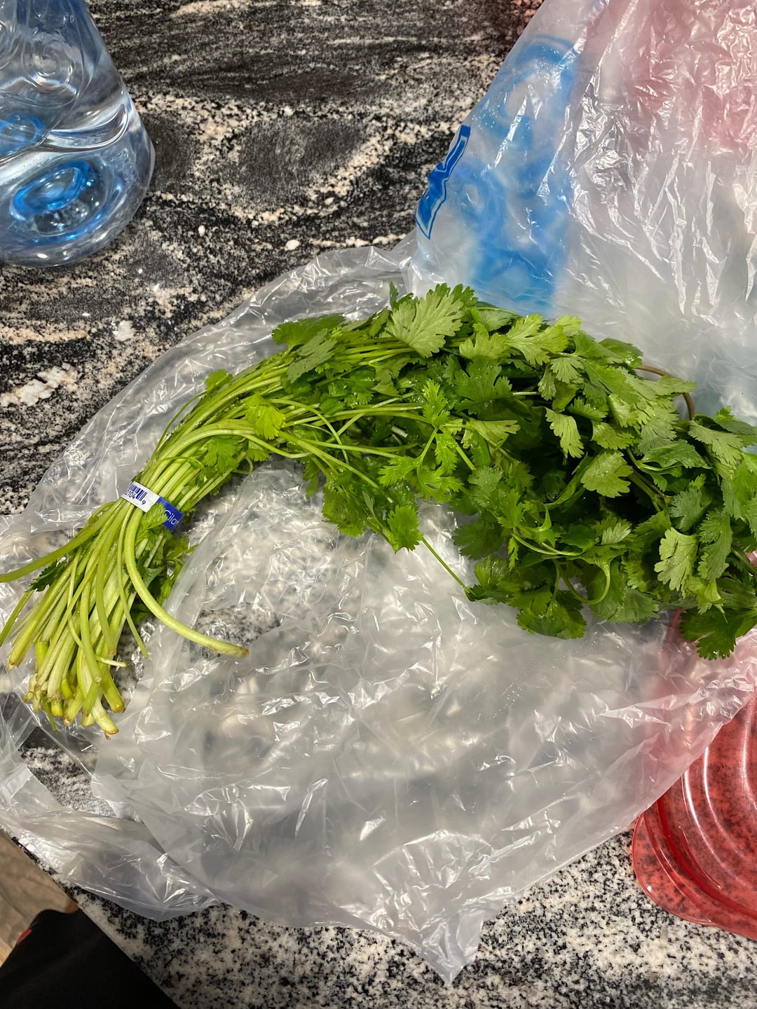 Add the Cilantro (just cut the Cilantro above the wrapper holding the bushel together and put the stems and all into the pan)