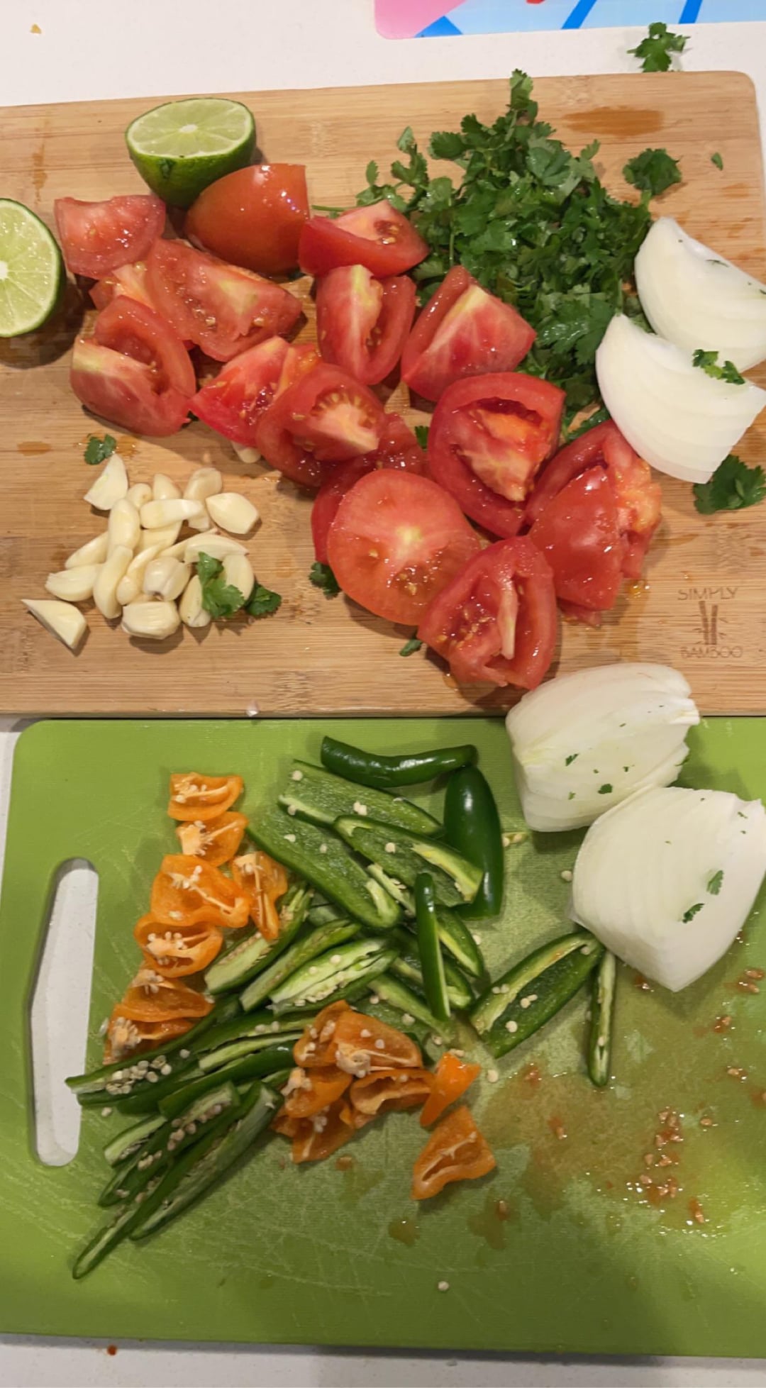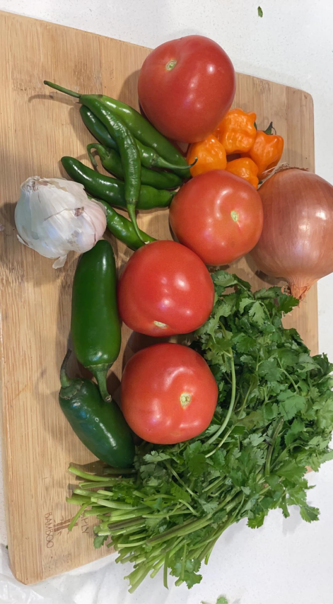 believeitornotjail 3 years ago 4 tomato’s6 serrano peppers2 jalapeños4 habaneroslike 3/4 onionall of the garlichowever much cilantro you desireone limei sliced all of the peppers and garlic length wise. roasted in a panthen added the onion (quartered) and lime to the pan for a bitthrew in all in the food processor. squeezed the lime. salt.it was way too thick so i added a small can of tomato sauce and it came out really well