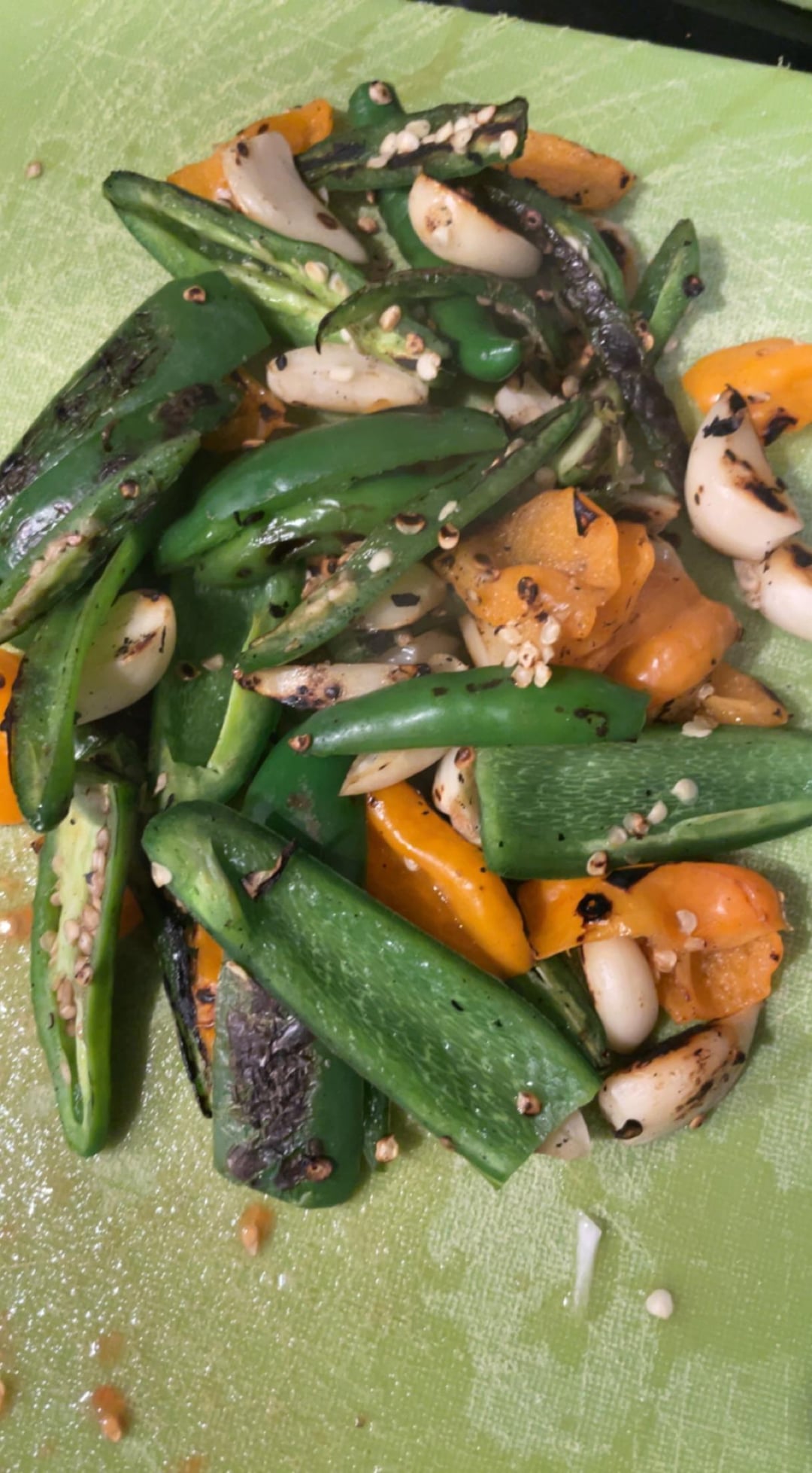i sliced all of the peppers and garlic length wise. roasted in a pan