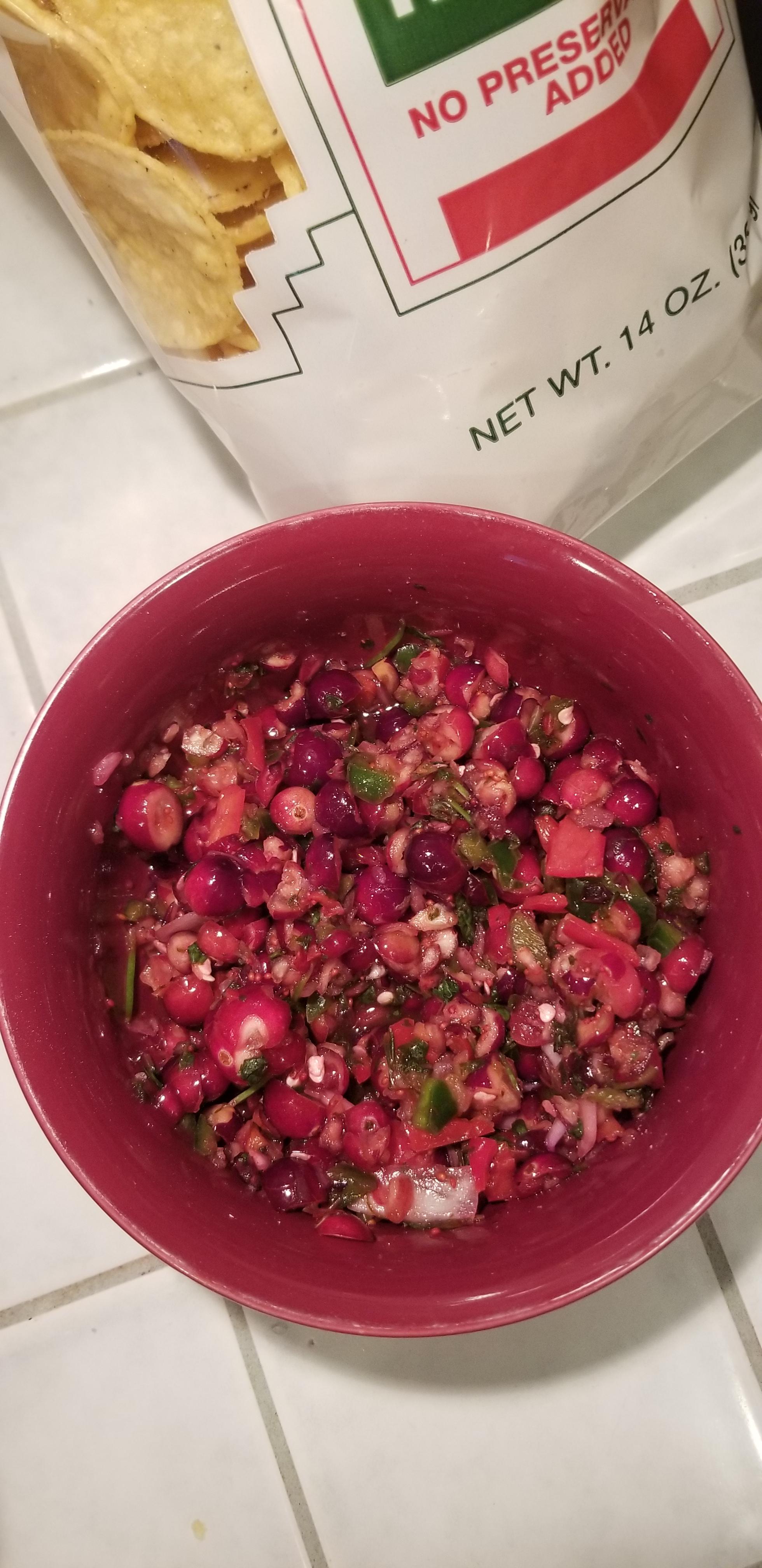 UnPrecidential 3 years ago Cranberries, cilantro, shallots, jalapeno, fresno and reaper peppers, garlic, lime juice, sugar, salt.