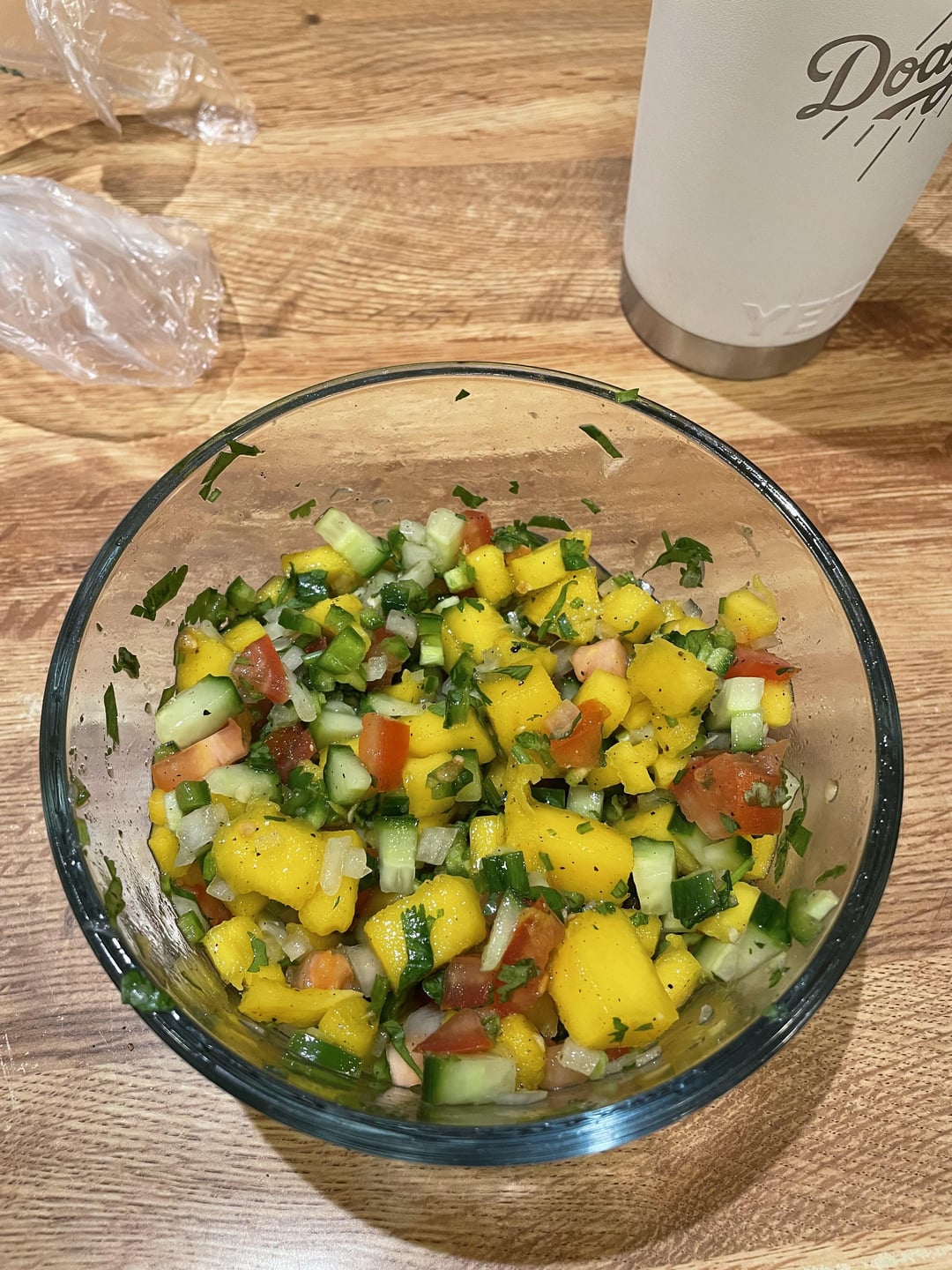 Mango, cucumber, tomato, onion, jalapeño, cilantro, salt, pepper, and lime