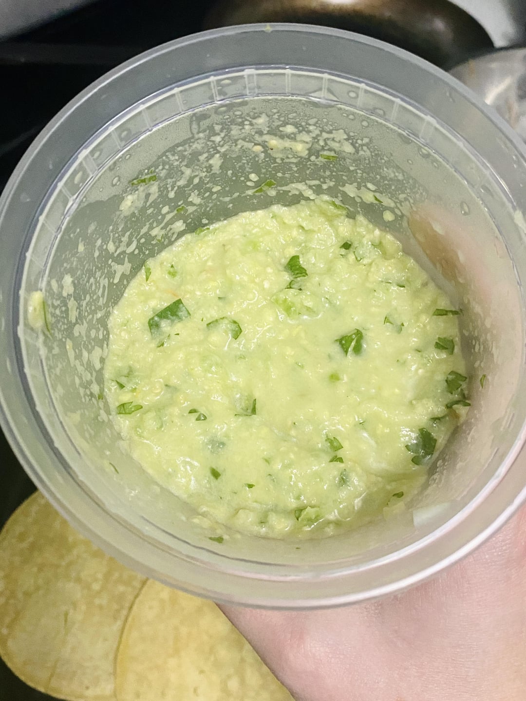 Three tomatillos, one quarter white onion, two cloves garlic, half a large avocado, two Thai chiles, 1/8 bunch of cilantro, avocado oil streamed in, juice of one lime, salt and pepper