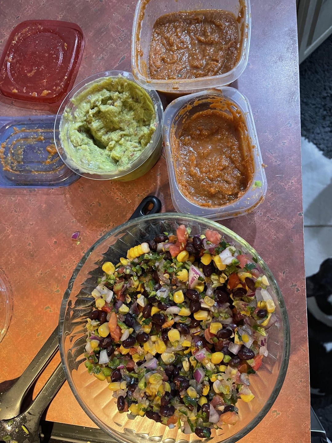 Roma and heirloom’s, red onion, corn black beans cilantro lime juice jalapeños