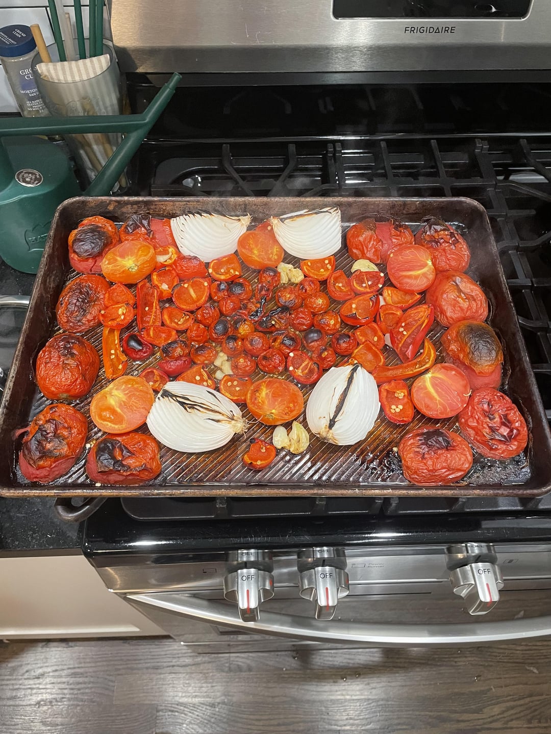 Romas and onions we’re from the store, everything else was garden grown: a handful of cherry bomb, 2 Fresno, 1 scotch bonnet, sweet 100 cherry tomatoes, cilantro. I guess the lime was from the store too.