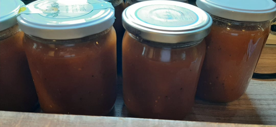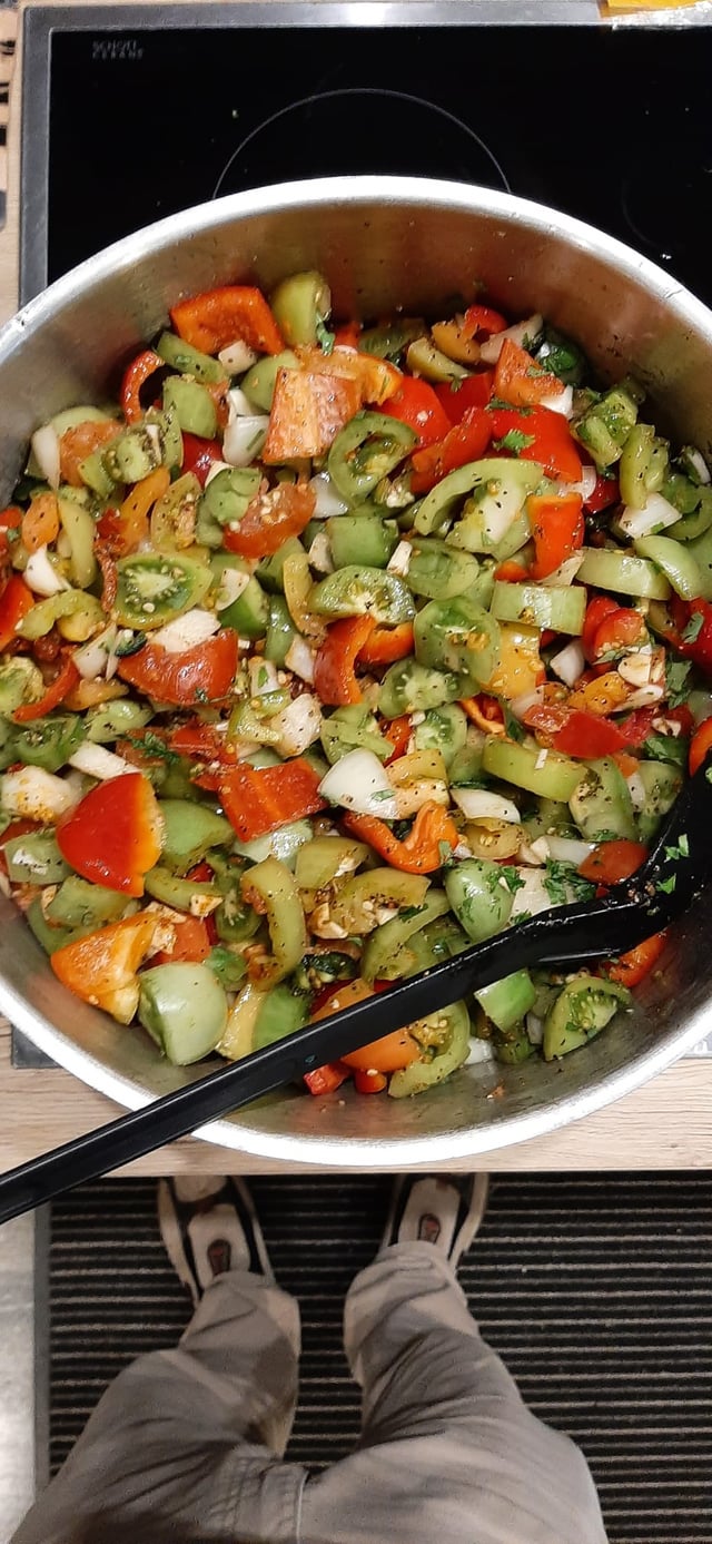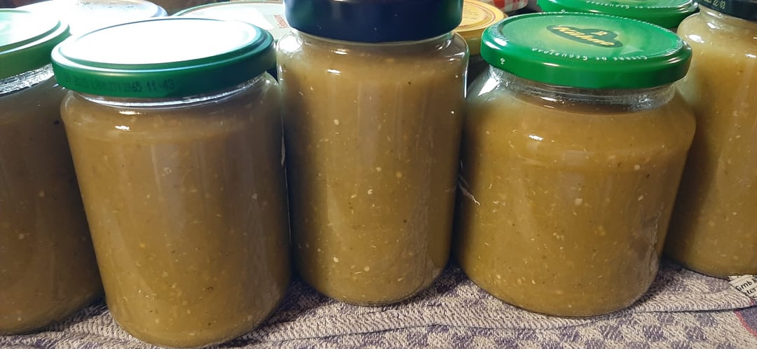 5 Lbs green tomatoes, 6 yellow onions, 3 jalapenos, 6 red bell peppers, 12 cloves garlic, 1 cup fresh cilantro, 1 cup lime juice, 1/2 cup white vinegar, 1 TBSP salt, 1/2 TBSP cumin, 1 TBSP oregano, 2 teaspoons black pepper, 1/4 teaspoon cayenne, 1 teaspoon sugar. Chop, slice and dice, cook to boil then simmer 3-4 hours. I then put in sterile jars and gave them a water bath at 90 degrees for 40 minutes….will stay fresh for 1 year.