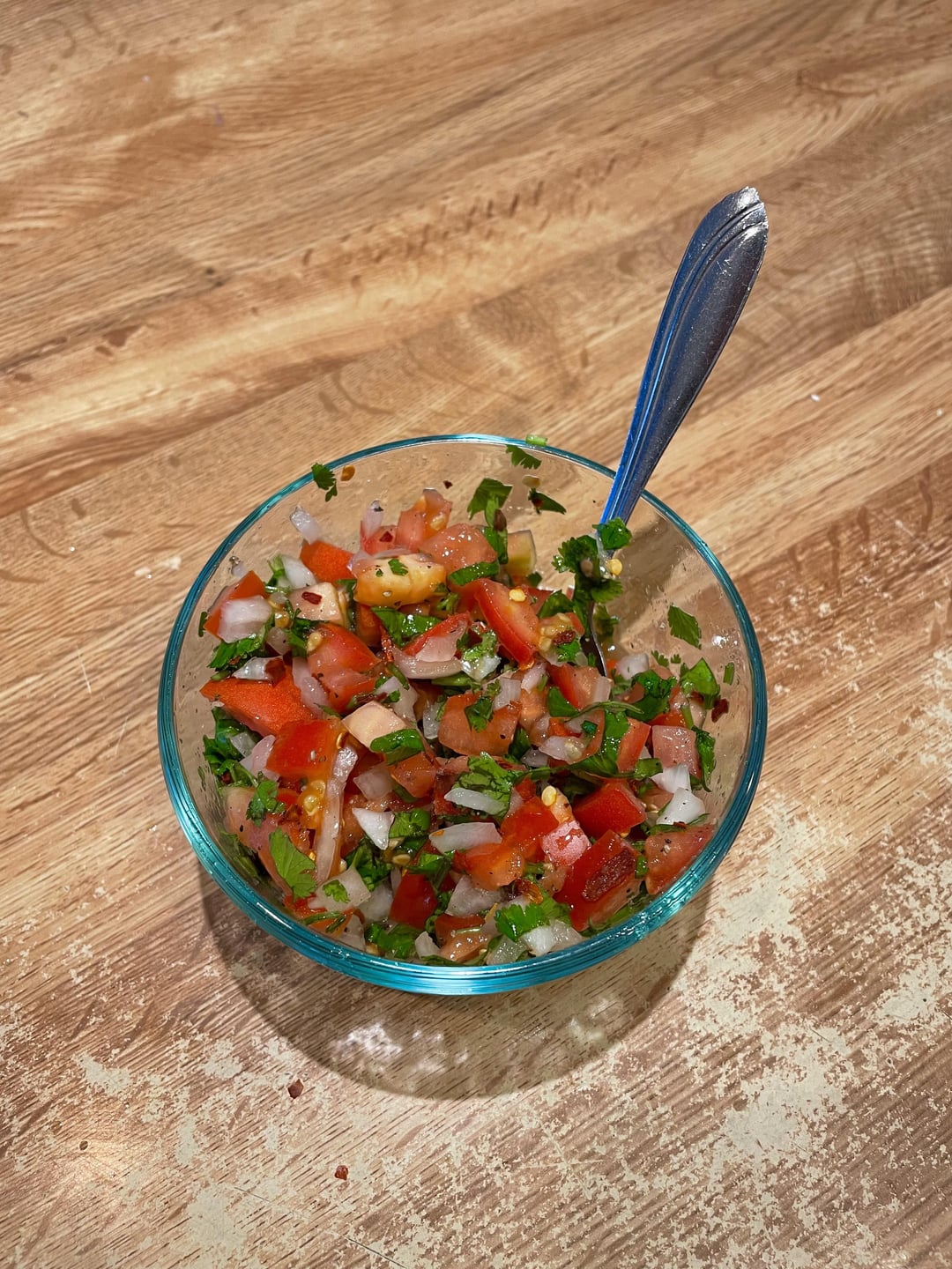 2 roma tomatoes, onion, cilantro, red pepper flakes, lime, salt and pepper