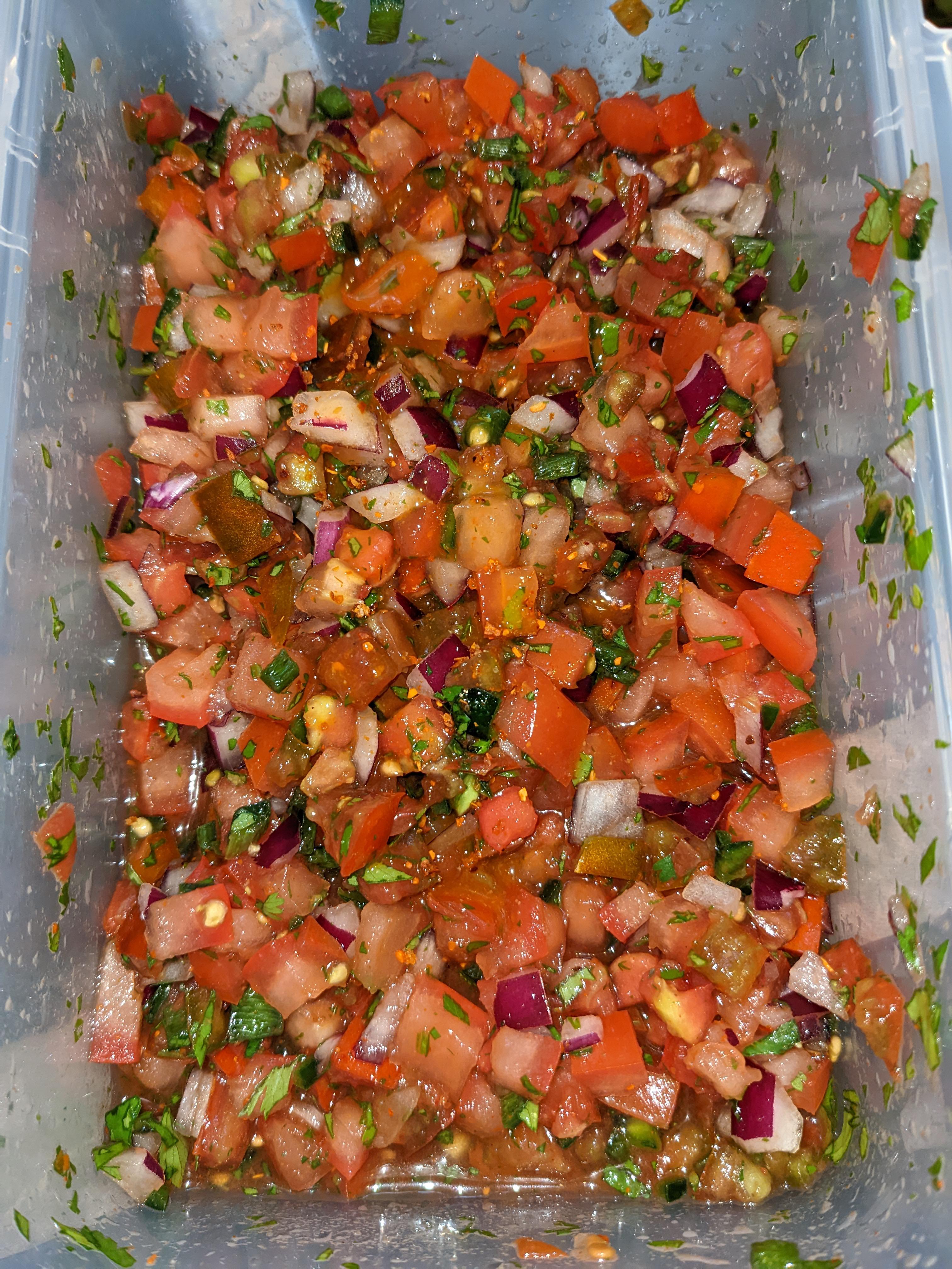 SwimmingExtreme1465 3 years ago It’s getting cold at night in Maryland, so my wife picked the last things from the garden this season3 heirloom tomatoes2 Romas1 minced poblano1/4 red onionCilantroA little MSGCholula for heatTajin seasoningDash of smoked paprika