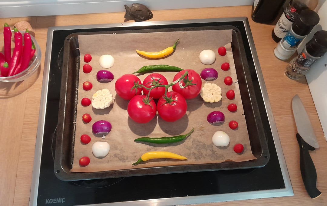 Roasted for about 25 minutes at 200°C, then removed the skins and stems from the tomatoes and peppers, added juice from 1 lemon, 1 teaspoon coriander, 1 tablespoon sugar, and blended.
