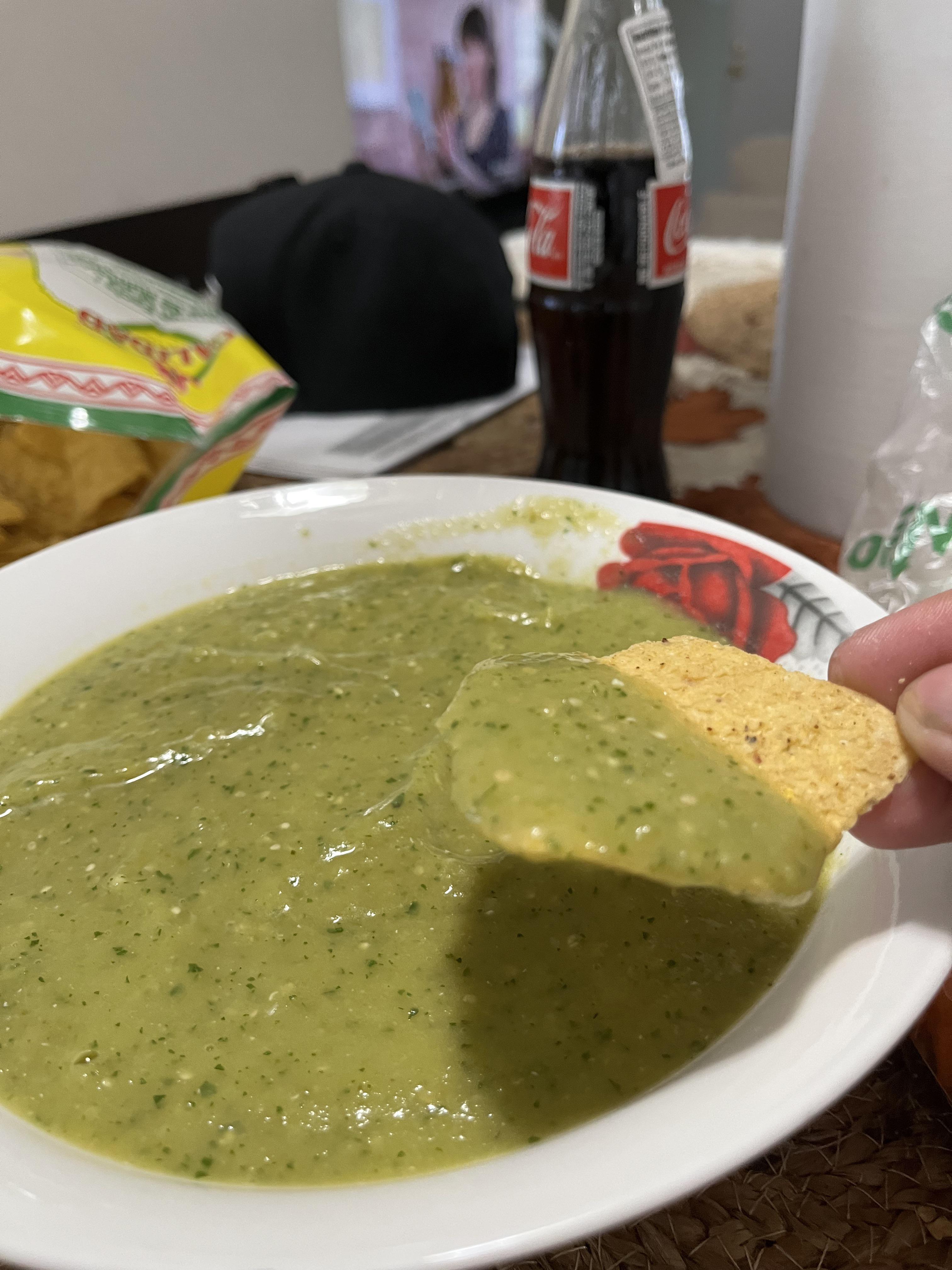 Salsa verde my way 10 tomatillos,5 Serranos peppers & half white onion boil all this together, then blend add salt and black pepper to liking and a whole avocado as I did here to make it thickkkkkk lol hope y’all enjoy if you do try at home.
