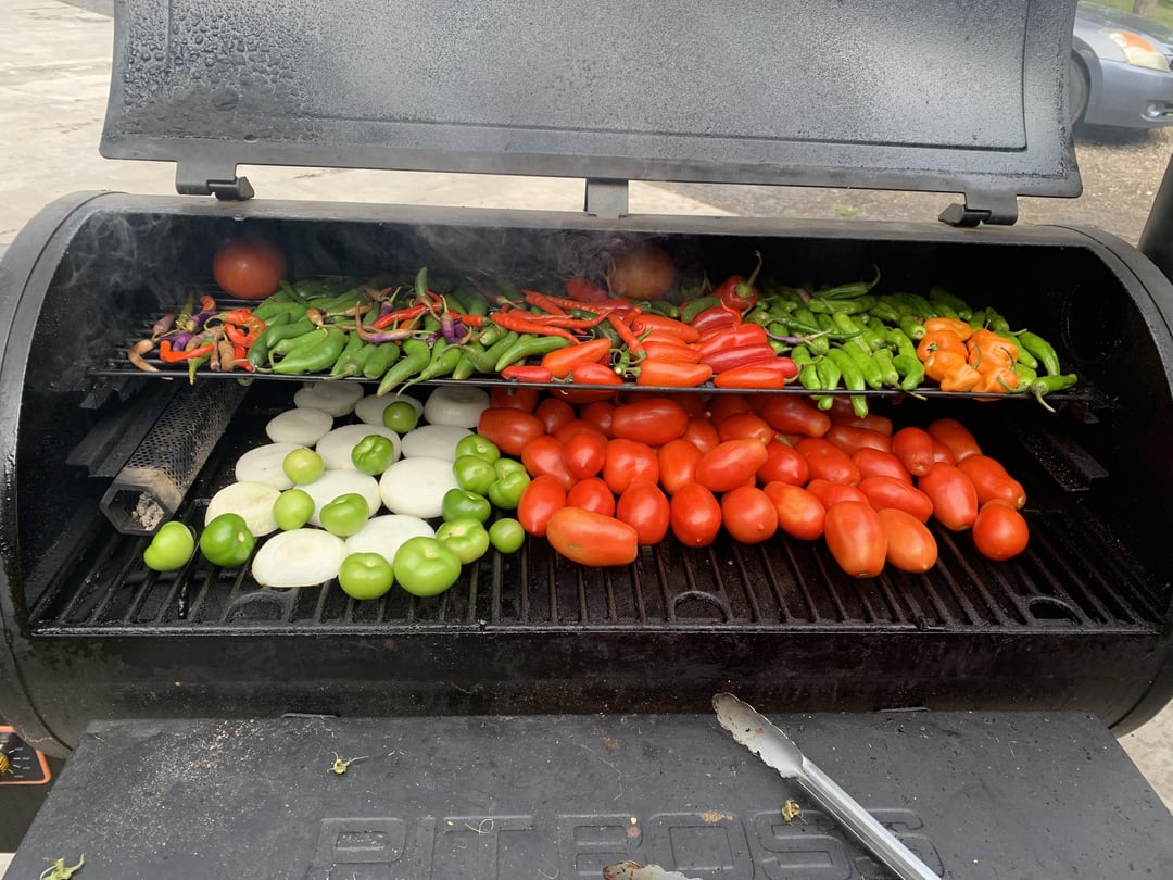 4lbs tomatoes, grilled and peeled/cored 1lb tomatillos grilled whole 2 lbs smoked hot peppers (jalapeño, arbol, shishito, habanero, serrano) 4 medium-large white onions sliced thick 2 bunches cilantro with ends of stalks trimmed off. Use the whole bunch of cilantro, stem and all. 1 small container of lime juice (you know the one) 1/4 cup salt