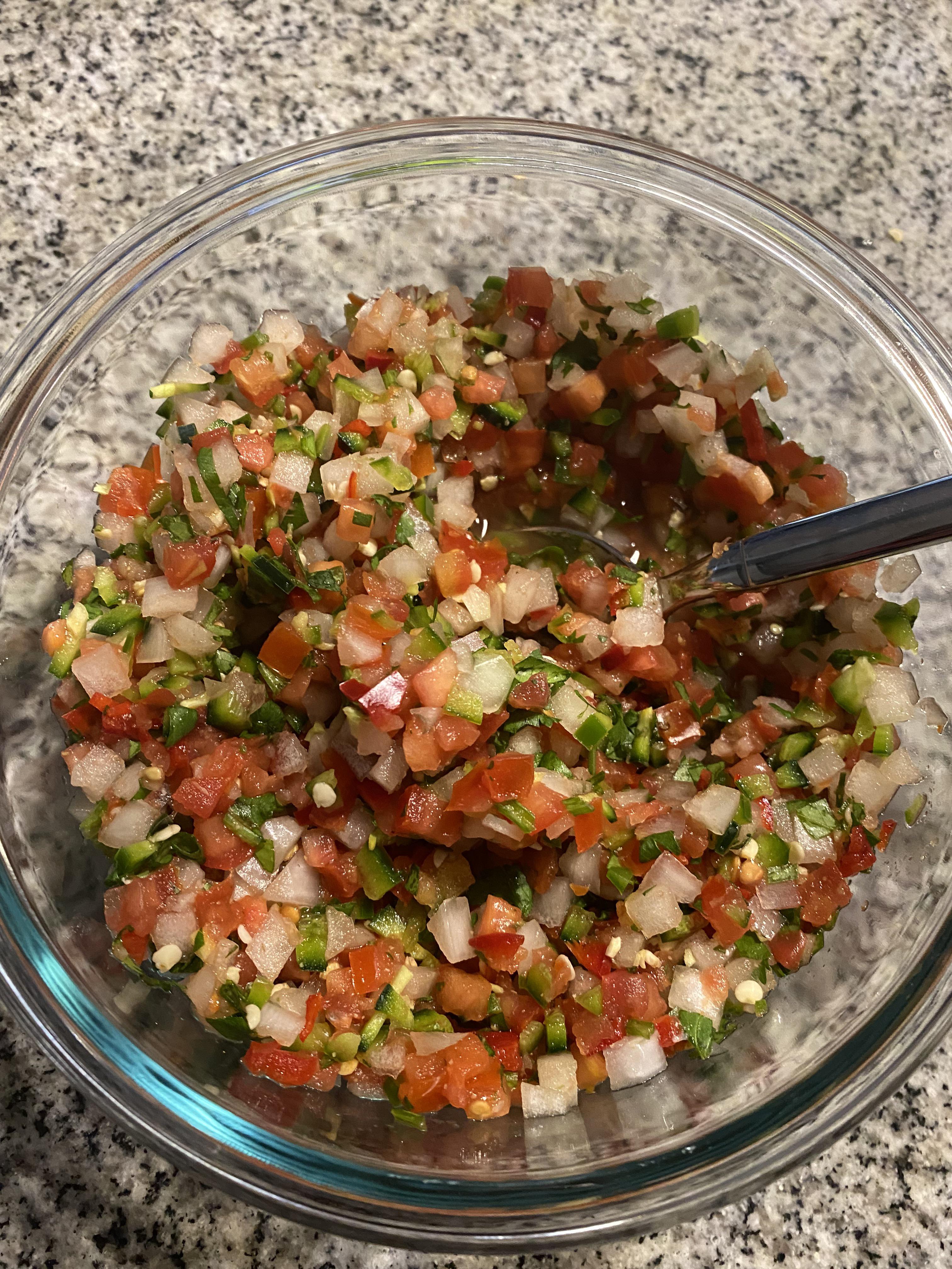 acrd97 3 years ago 4 tomato’s, 1/2 white onion, 2 garlic cloves, 1tbsp lime, 1 tbsp apple cider vinegar, 1/4 tsp cumin, handful cilantro, 1 jalapeño, 1 Fresno chili, 1 F1 Sriracha, 1 super chilie.