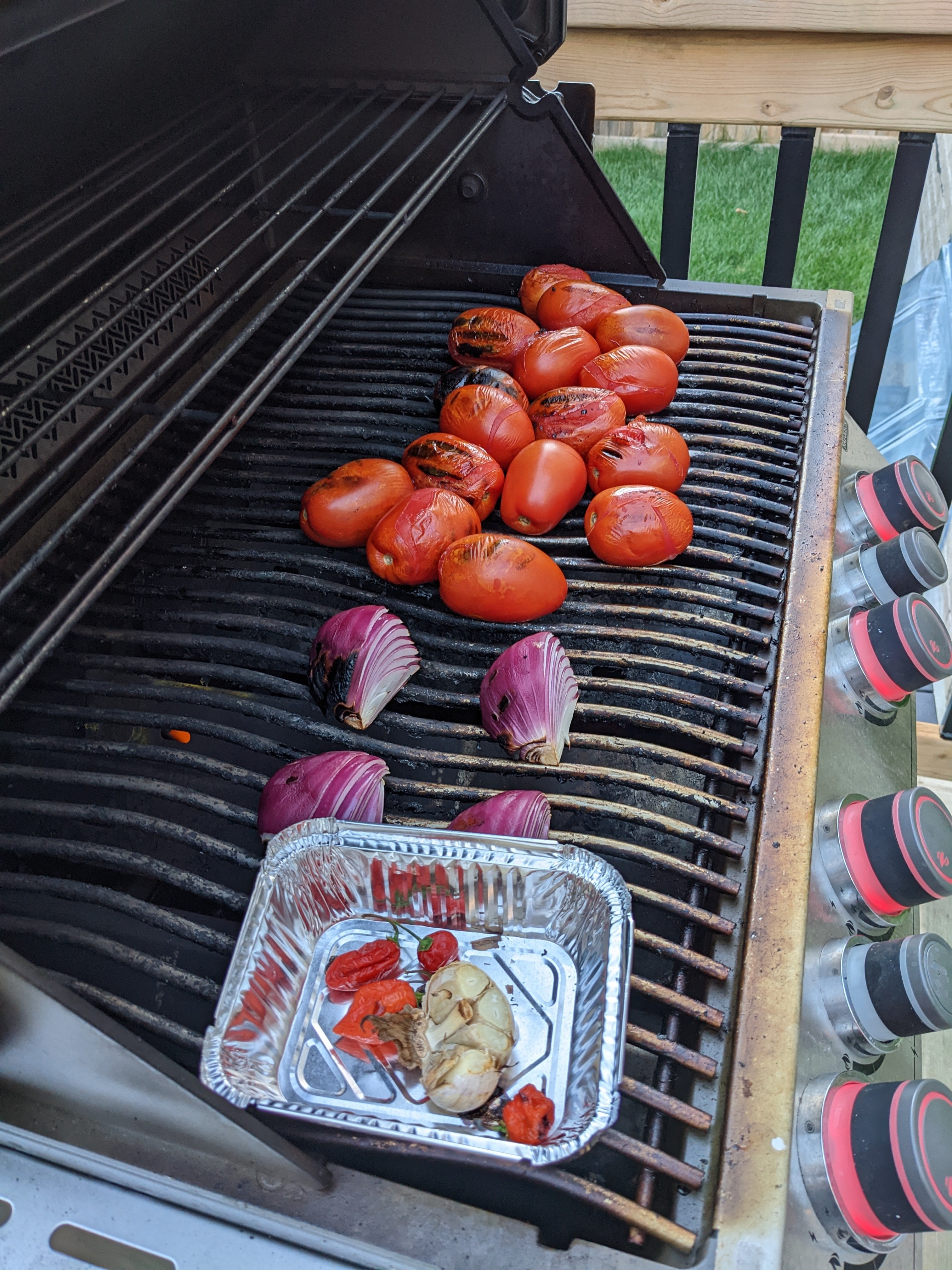 One basket of in season Roma Tomatoes, 1 red onion, 4 gloves of garlic, 4 garden grown habaneros, charred on grill, put in blender, add parsley, 3 lines, and 2 raw garlic cloves and some salt.