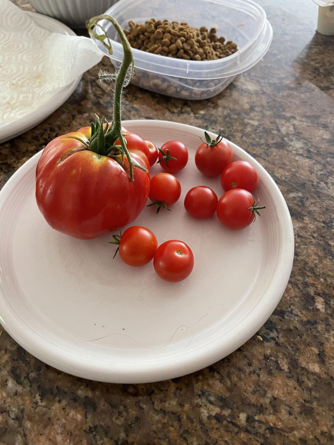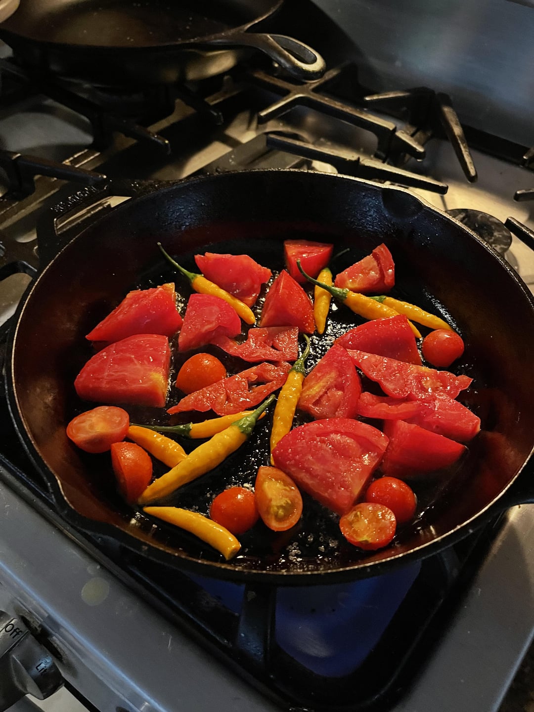 Fresh picked from my garden. I have no idea what type of peppers these are but they a really hot out of the gate but mellow out quickly. Fresh Tomatoes (steakhouse?) and cherry. Mystery peppers. Red onion, garlic, fresh lemon juice, cilantro and a pinch of salt. Very tasty
