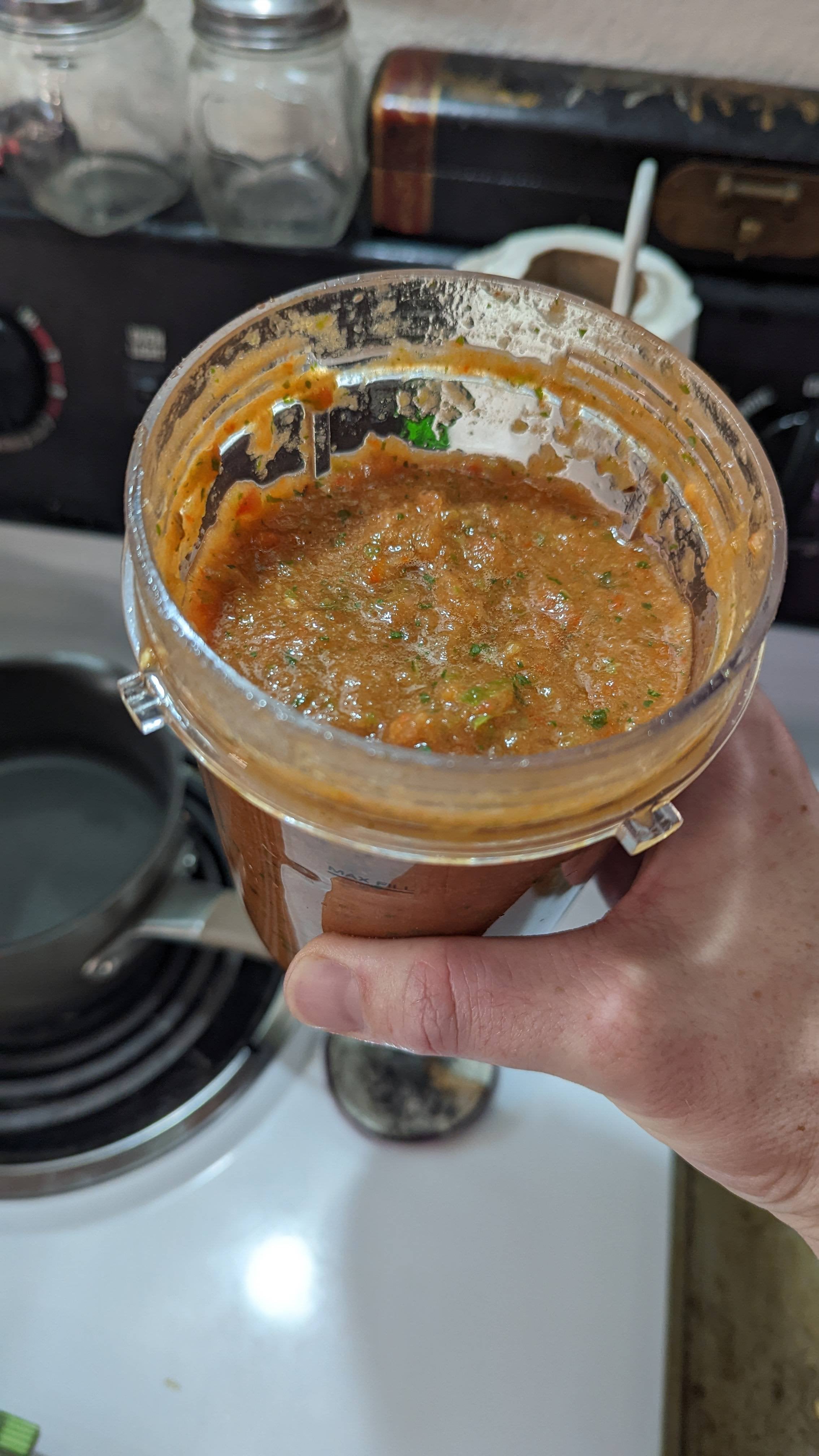 I looks good. 2 things helped me improve the color of mine – using red onion & not blending the onion && adding habanero instead of jalapeño. I hated the brown that would come out of using too many jalapeños, totally unappetizing but still very delicious.