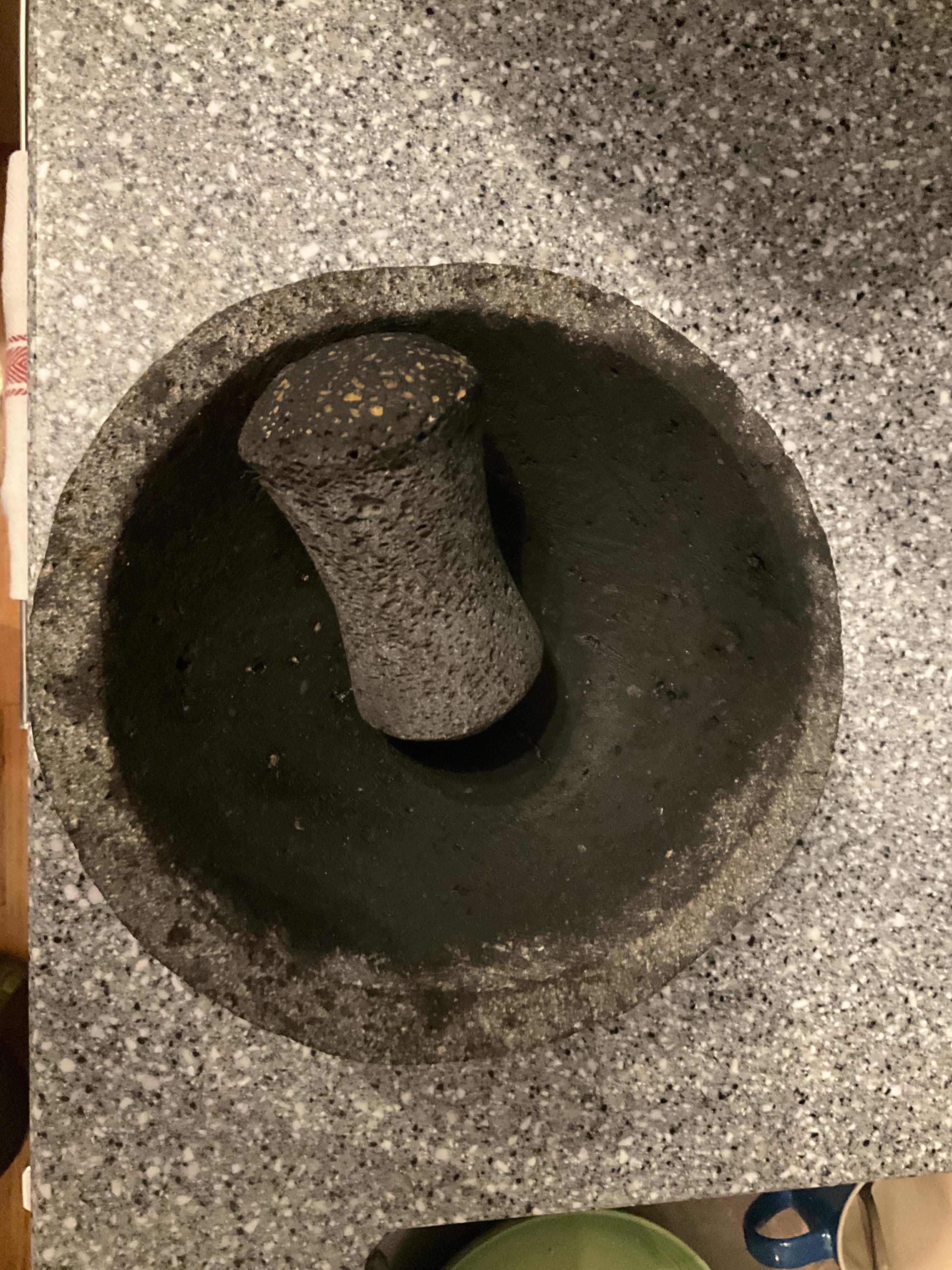 I used my molcajete to mash some pine nuts then added some pretty ordinary spices to it and used the pestle to bring it all together. I cleaned it with water only, wiped it out and let it dry. The next morning the inside and the bottom of the pestle were black and it won’t come off. Anyone have a suggestion as to what caused it and how to fix it? It’s not coming out