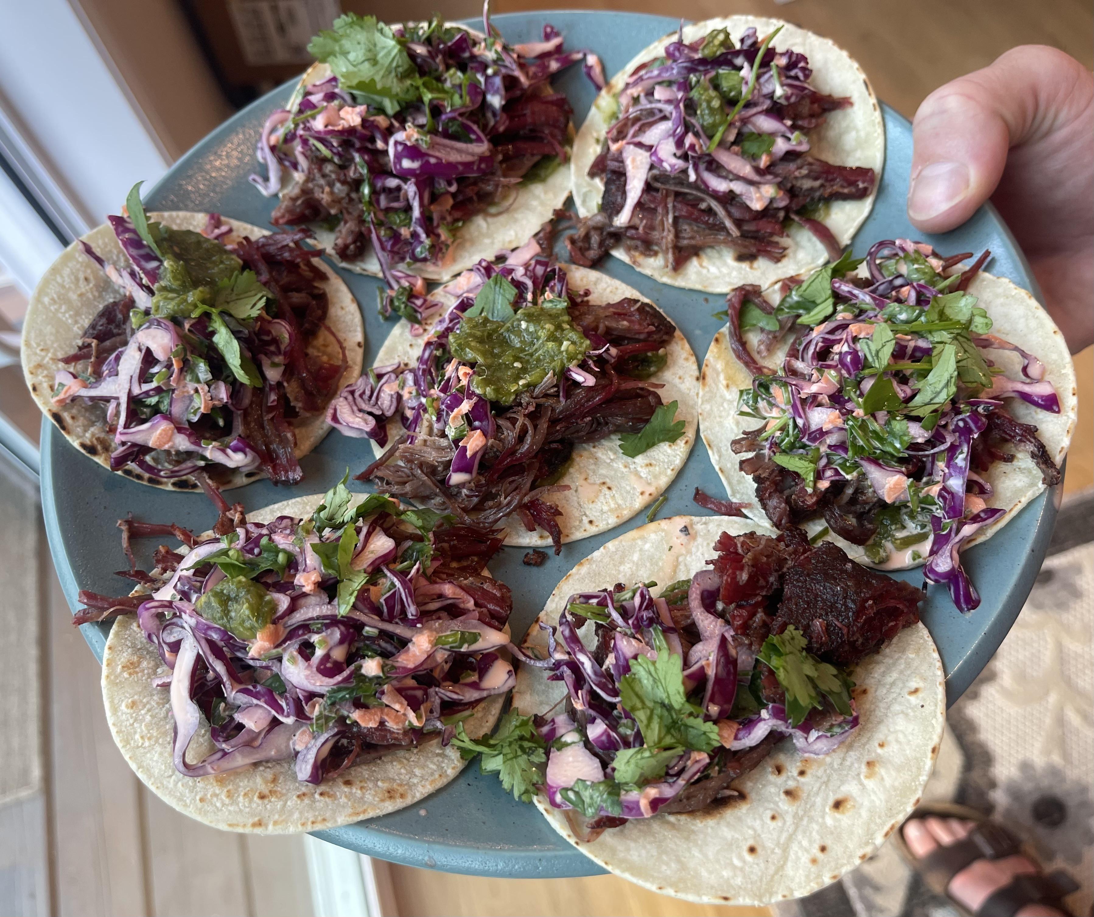 Smoked Salsa Verde atop Smoked Barbacoa Tacos!