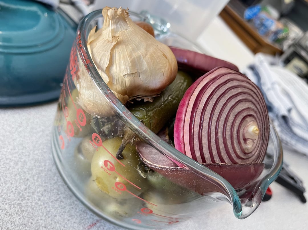 8 medium tomatillos, half a sliced onion (any color will do), 4 jalapeños (or more if you like it spicy), a bunch of cilantro diced, a whole head of garlic left whole
