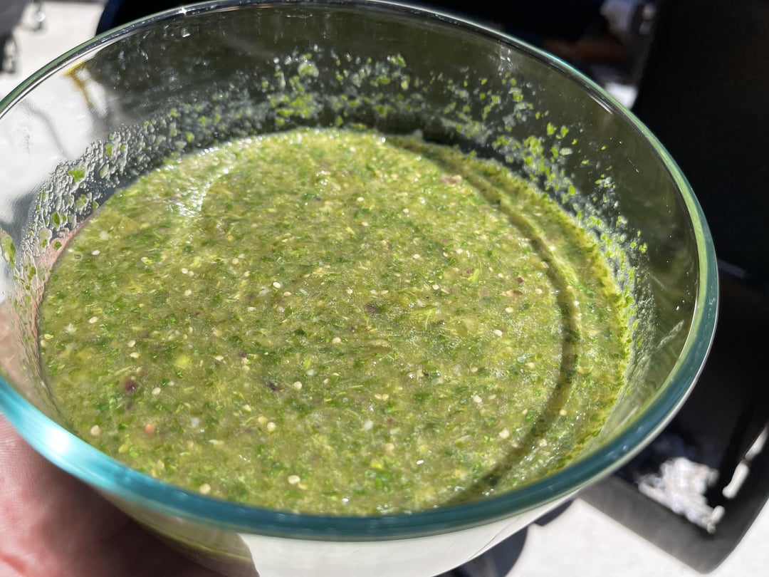 carnitascronch 3 years ago Ingredients/recipe8 medium tomatillos, half a sliced onion (any color will do), 4 jalapeños (or more if you like it spicy), a bunch of cilantro diced, a whole head of garlic left wholeSmoke the garlic, onion, jalapeño, and tomatillos on an offset smoker held around 225, for an hour (I used post oak wood for this smoke, pecan, hickory, etc will work). When tomatillos are soft to the touch, remove all ingreds from smoker and purée after peeling garlic, adding cilantro when cooler. Salt to taste!