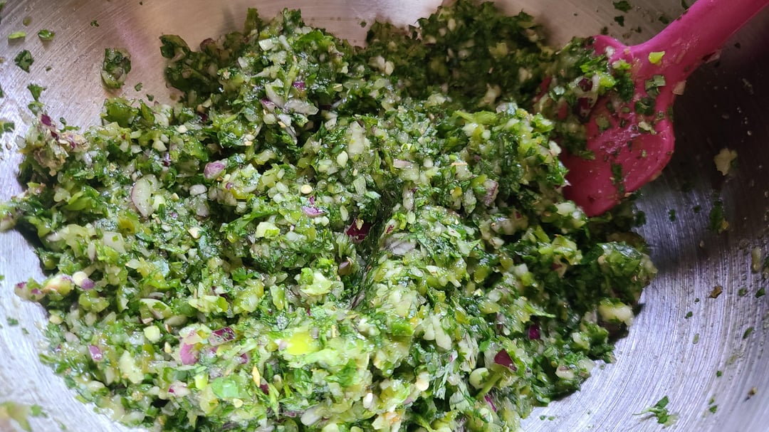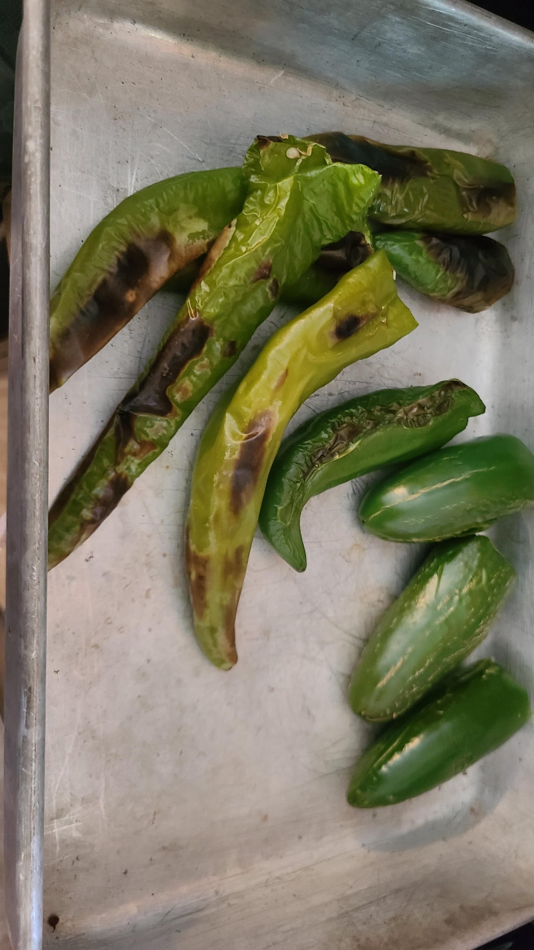 The exceptions are that I added roasted hatch chilies instead of the anaheim and poblano, I used 2 bunches of cilantro, and I added 1/2 cup of vinegar.