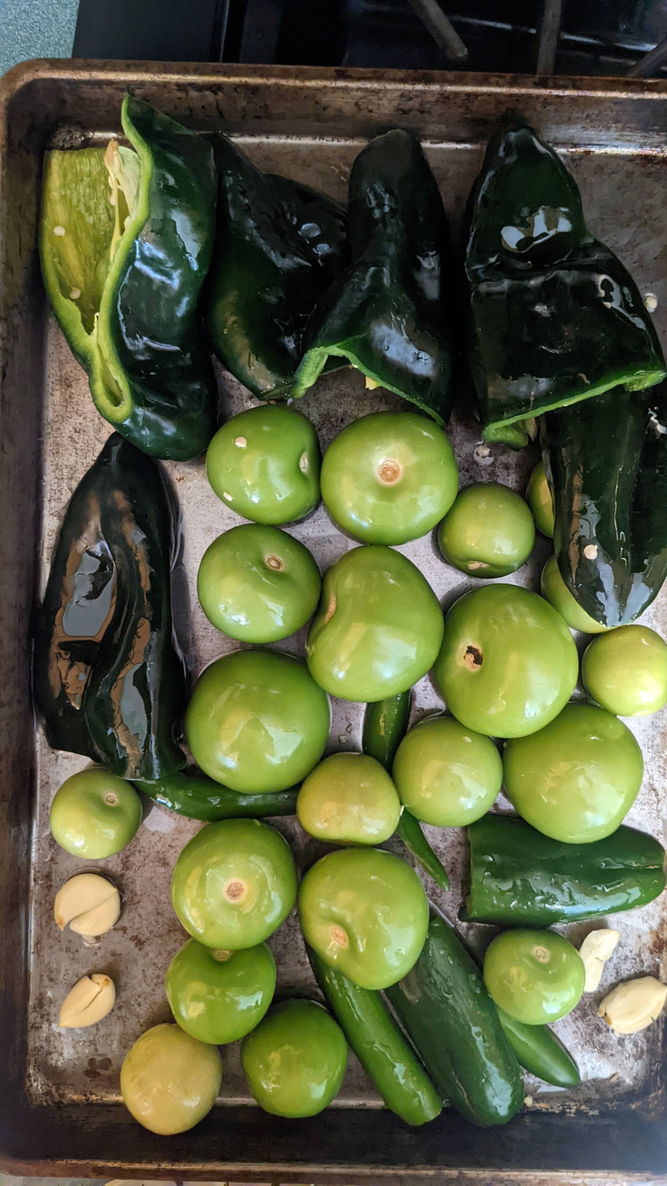 Like 2 lbs of tomatillo, Idk four poblanos?, Two serranos, One jalapeño (gutted), Like 4-5 garlic cloves, Half a white onion, About a bunch of cilantro, Juice from two limes, Olive oil, Salt and pepper.