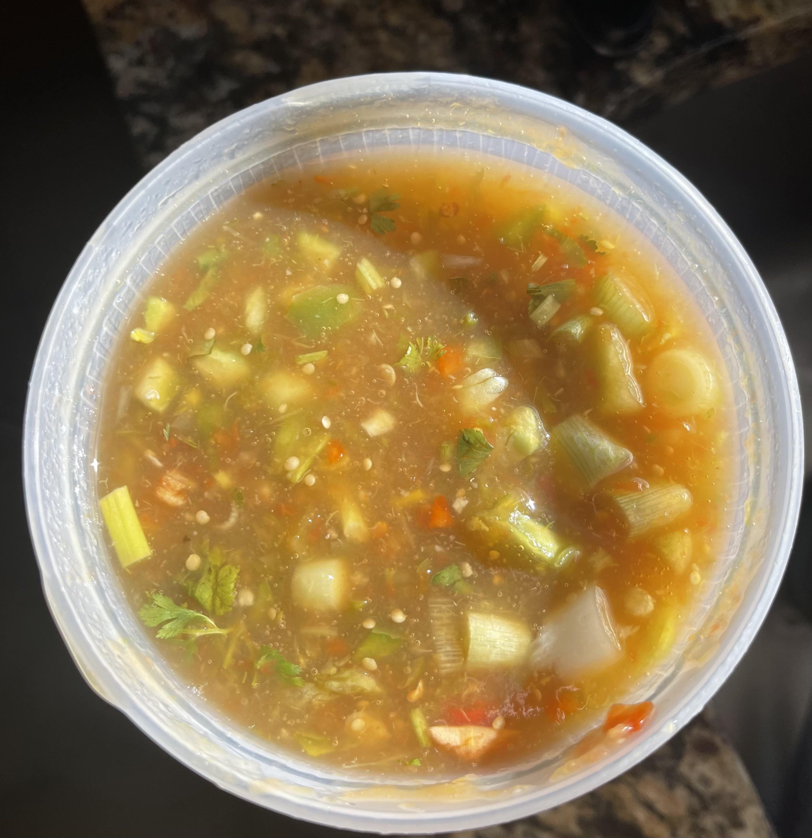 It’s kinda watery/thin but has big chunks of onion, green onion, cilantro and what looks like some sort of red and green pepper. It’s not spicy at all and very tangy, like it’s heavy on the lime and onion flavor.