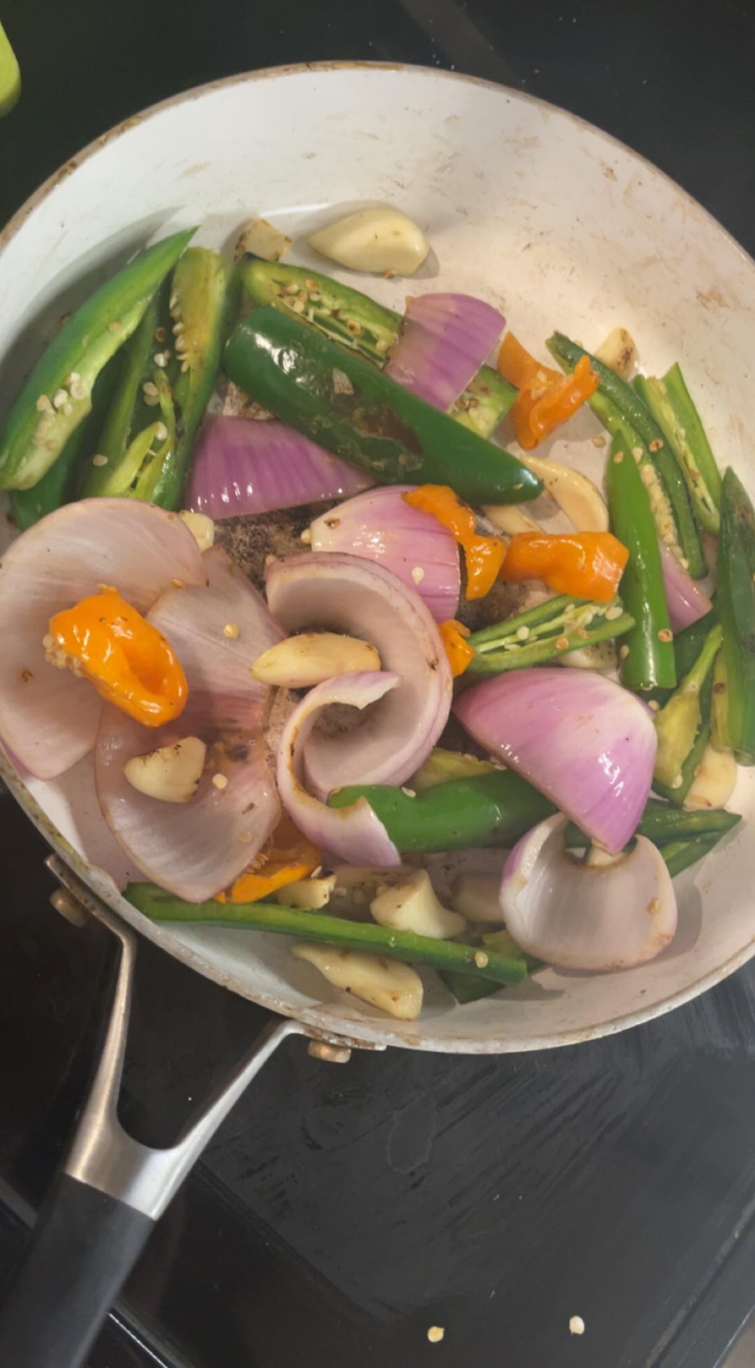 slice all peppers lengthwise. cut onion. peel garlic. char in a pan