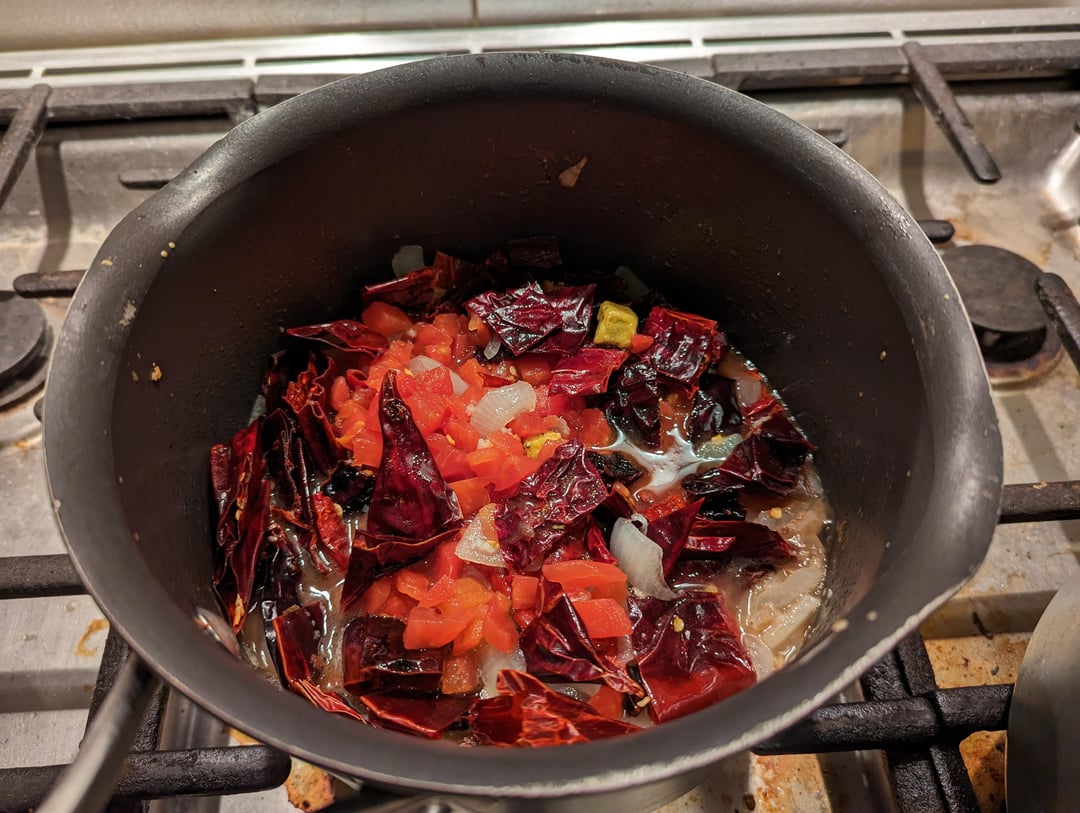 I was very happy with the results and the final sauce will definitely not be mistaken for an enchilada sauce. 4 tablespoons of butter might sound like a lot, but the amount of butter that goes into a delicious Indian curry would shock most people. The use of four different types of dried chili gives it a nice complexity. This recipe will be going into my file to make for guests again in the future.
