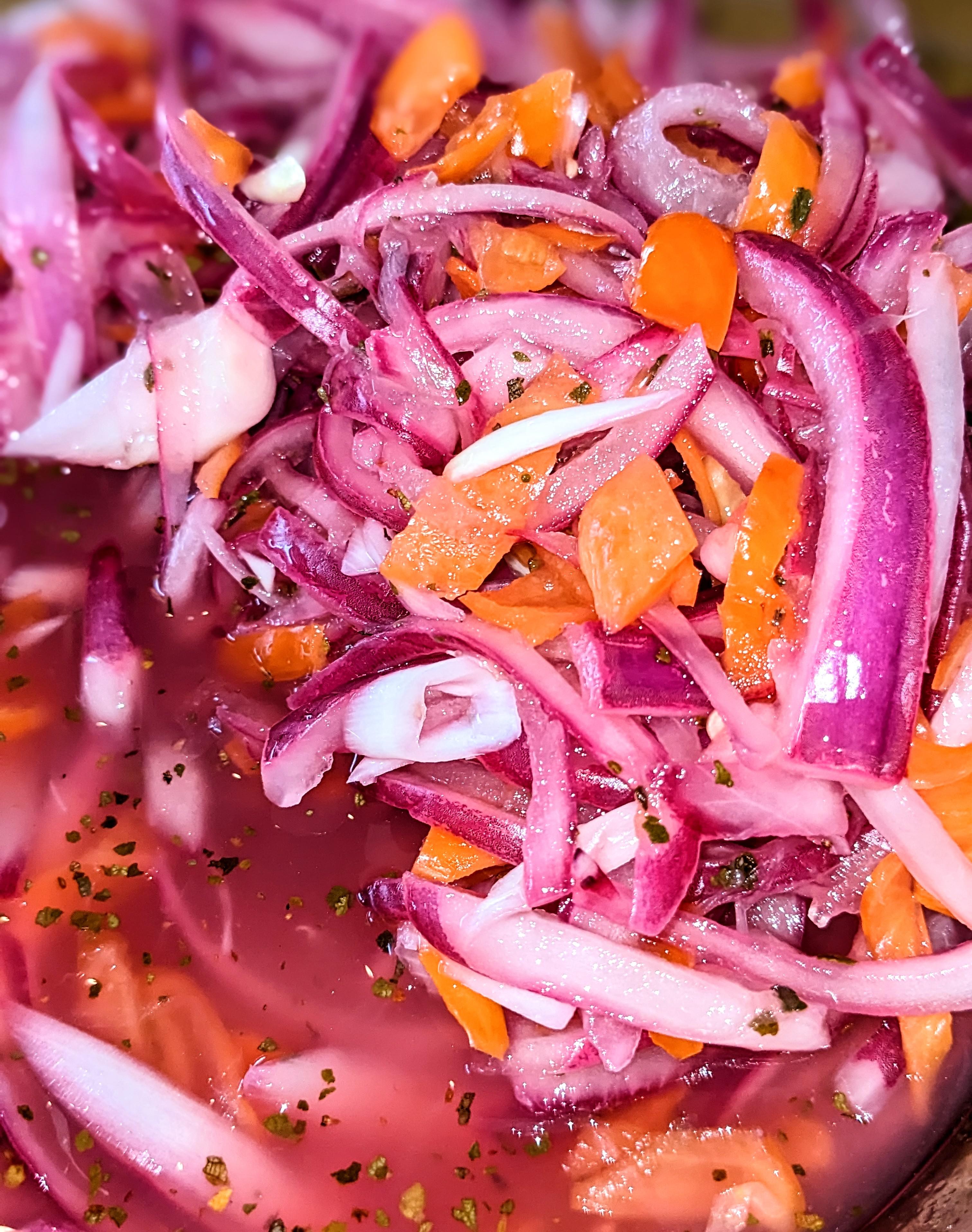 Just a finely sliced red onion with a lot of habanero, marinated with half lime and half white vinagre with a bit of oregano and salt. Traditionaly marinated with bitter orange.