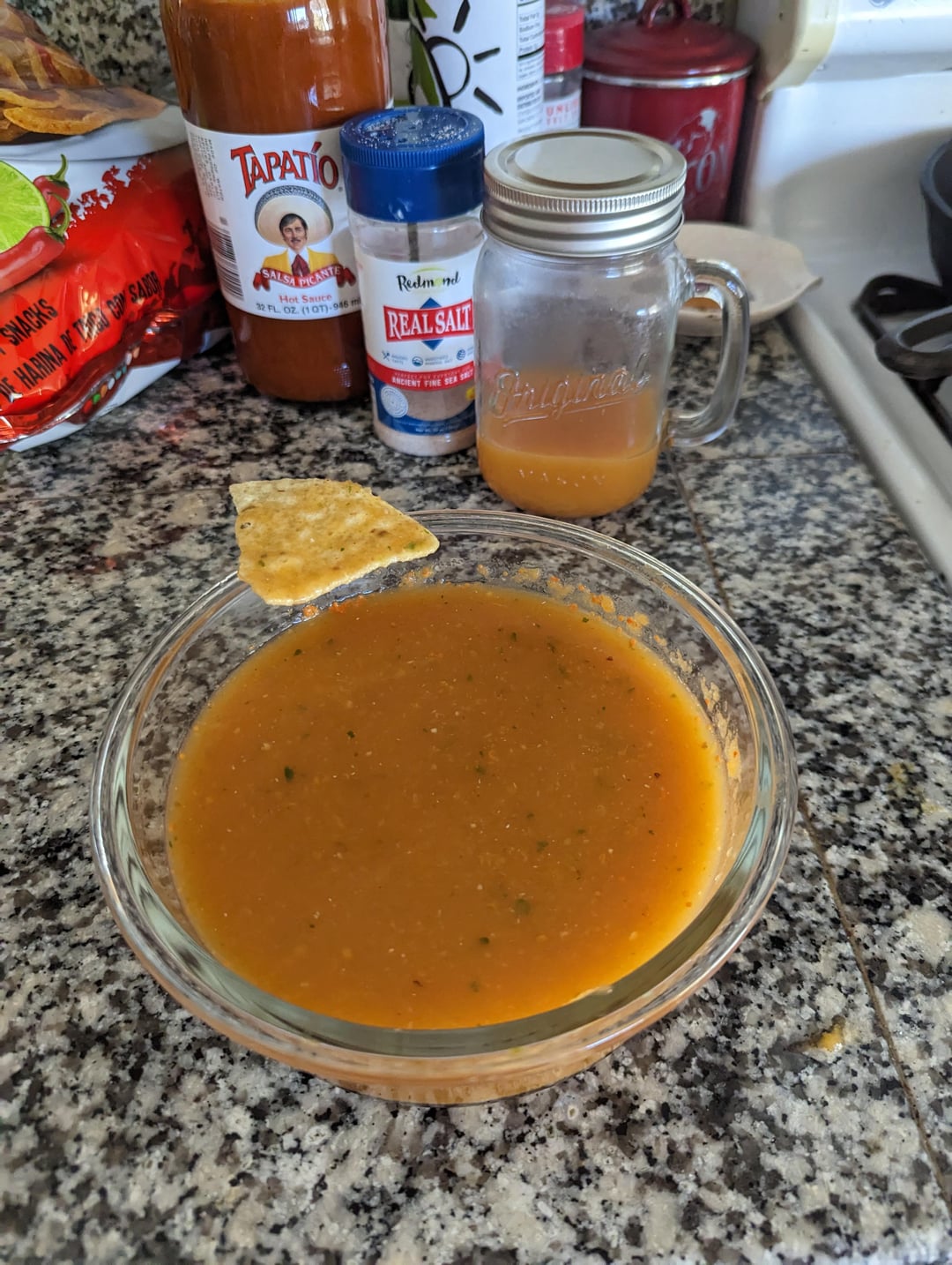 Smok-_-em 3 years ago 3 tomatoes3 serrano’s5 habanero’s1/2 medium yellow onion2 garlic gloves1/2 tbsp of chicken bouillon5 cilantro sprigsBoiled everything minus the cilantro, removed tomato skin and cores and into the blender it went. Strained excess liquid until I got it to my desired consistency.