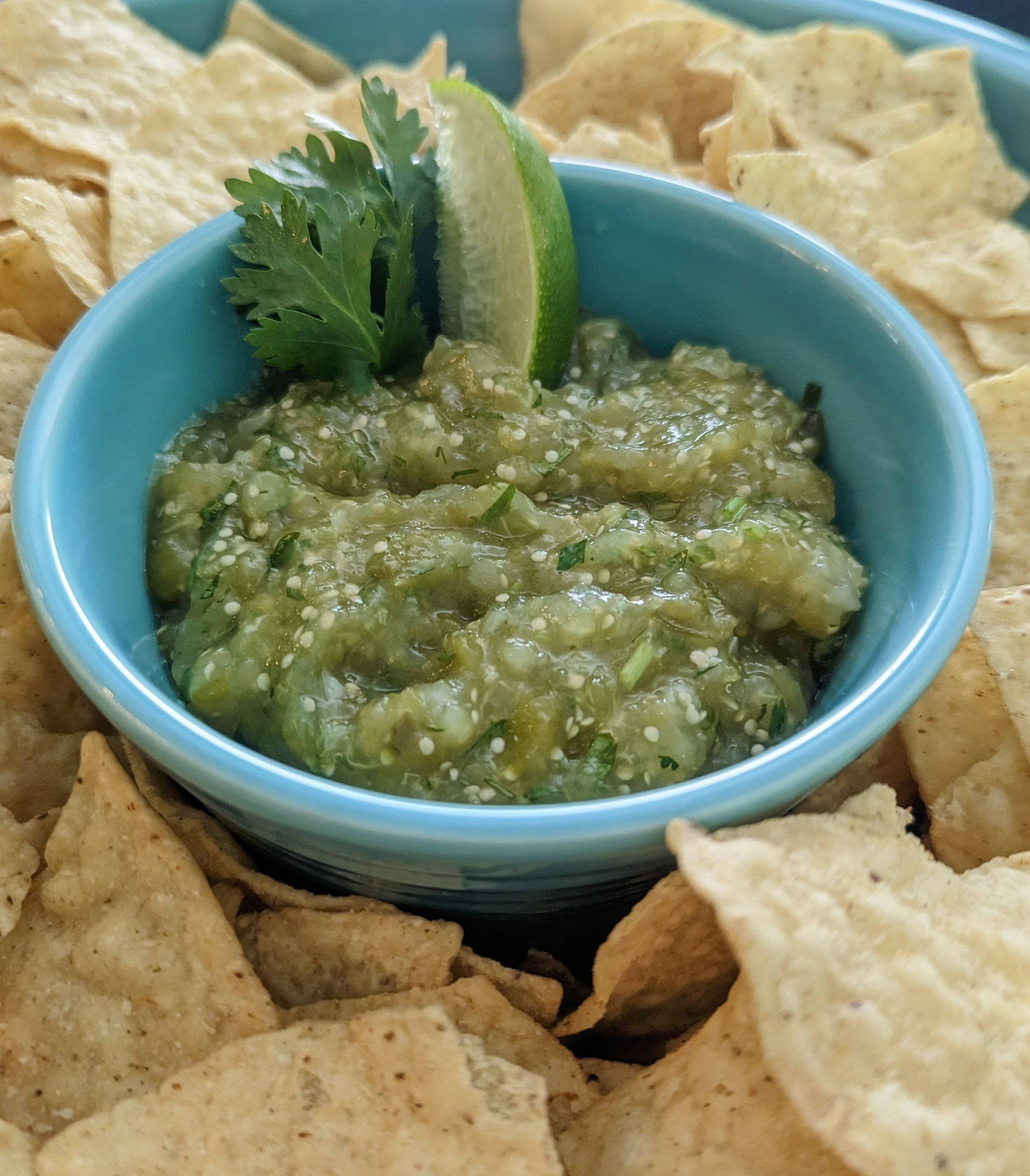 BridgetteBane 3 years ago Recipe-* 9 tomatillos * Half a jalepeño* 1/2 cup onion * 1/4 cup cilantro, very fine * Salt and lime to tasteBoil the tomatillos and jalapenos until the toms turn color.Coarsely chop the tomatillos, jalapeno,l and onion. Place in a food processor and pulse until chunky but mostly smooth.Add cilantro, salt, and lime!