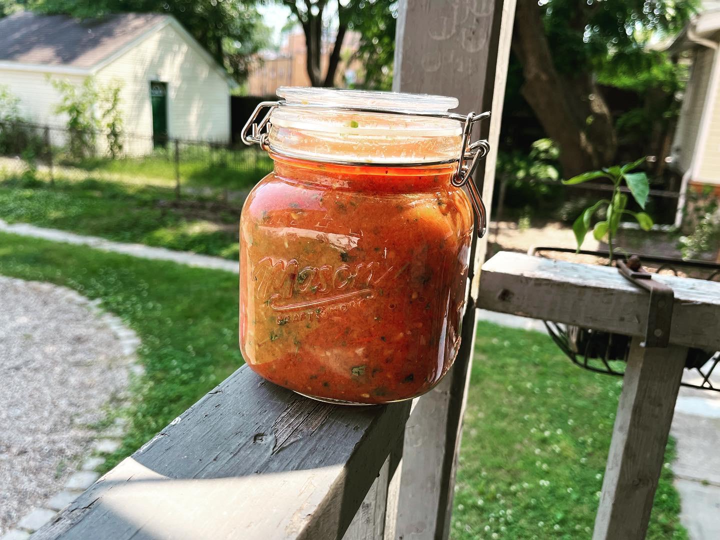 TLhikan 3 years ago Ingredients:1.5 (ish) lbs of tomatoes (mix of Roma and heirloom)4 Jalapenos (mostly deseeded)1 Red Onion2 cloves of garlicSplash of pickled onion juiceSaltPepperCuminSmall bunch of cilantro leaves.Roasted the vegetables in the fire pit ([like](https://drive.google.com/file/d/1sQtbUvOoUcPbFDF1eR_jz8SuKw-Ii9J1/view?usp=sharing) [so](https://drive.google.com/file/d/1Y2U_uEHHUvx2cZB8dgw04WzKXPmJRzHD/view?usp=sharing)), cut out overly burned bits, stems, and most of the seeds/cores of the Jalapenos. Blended and added salt, pepper, cumin, and pickled onion juice to taste.